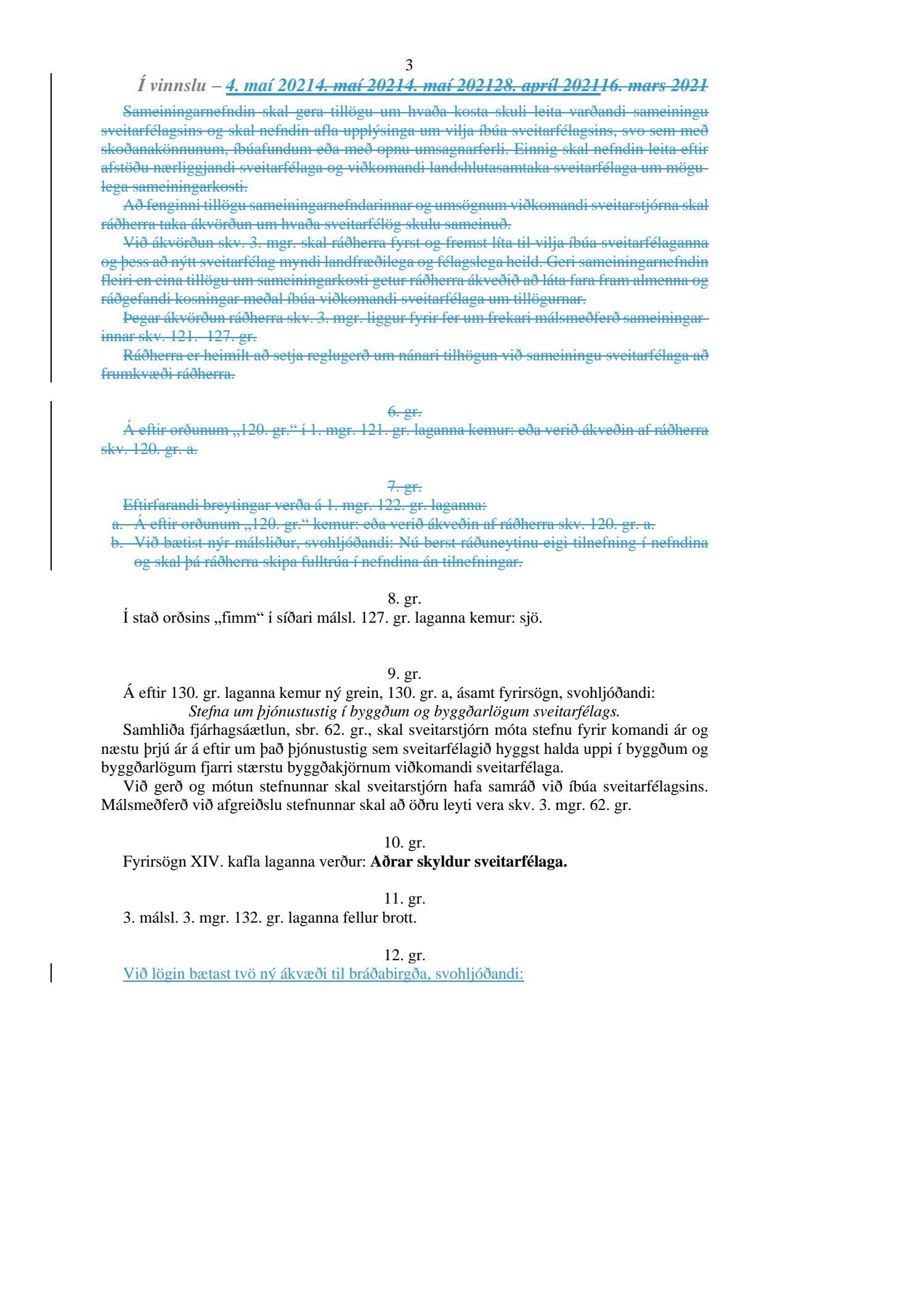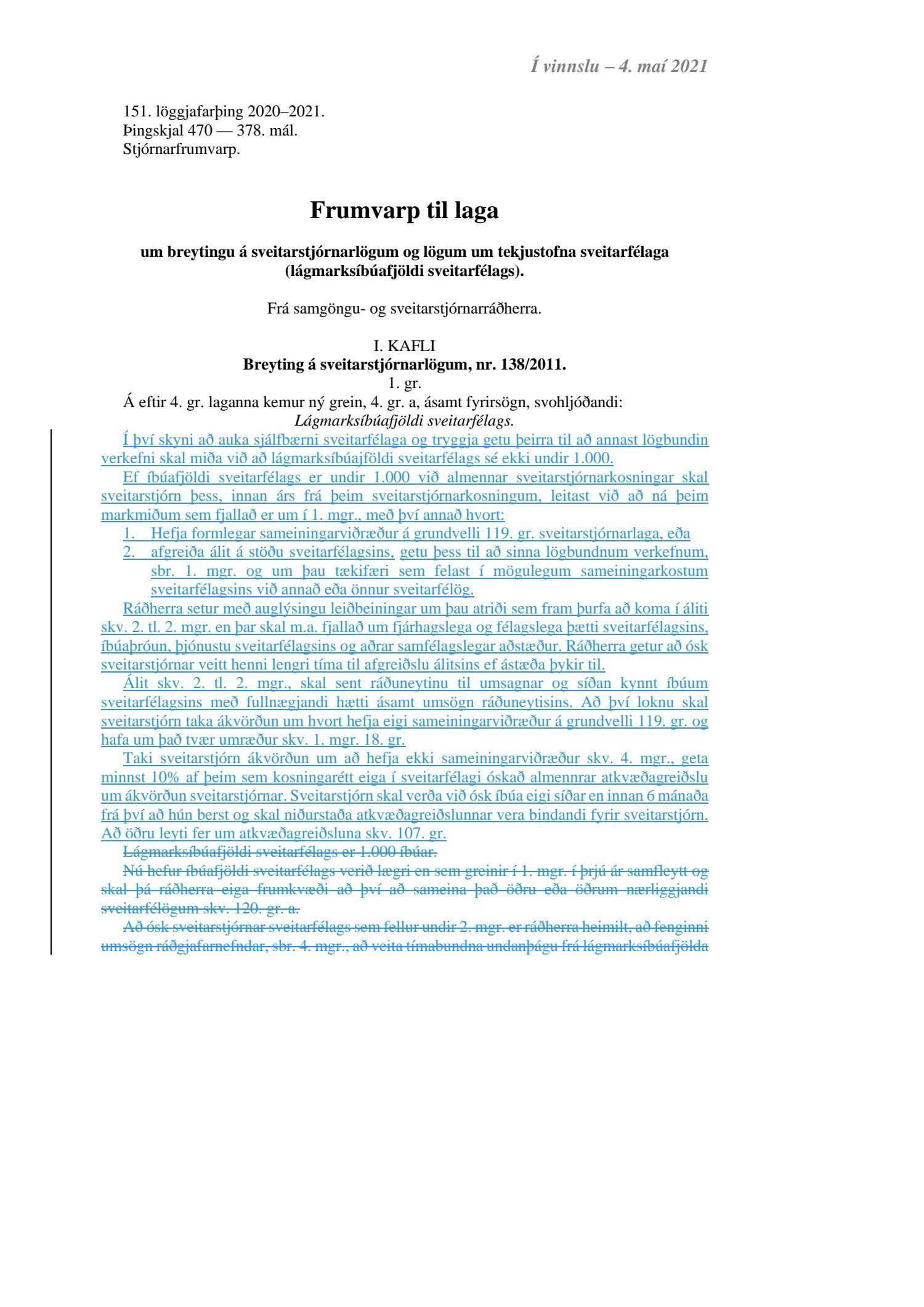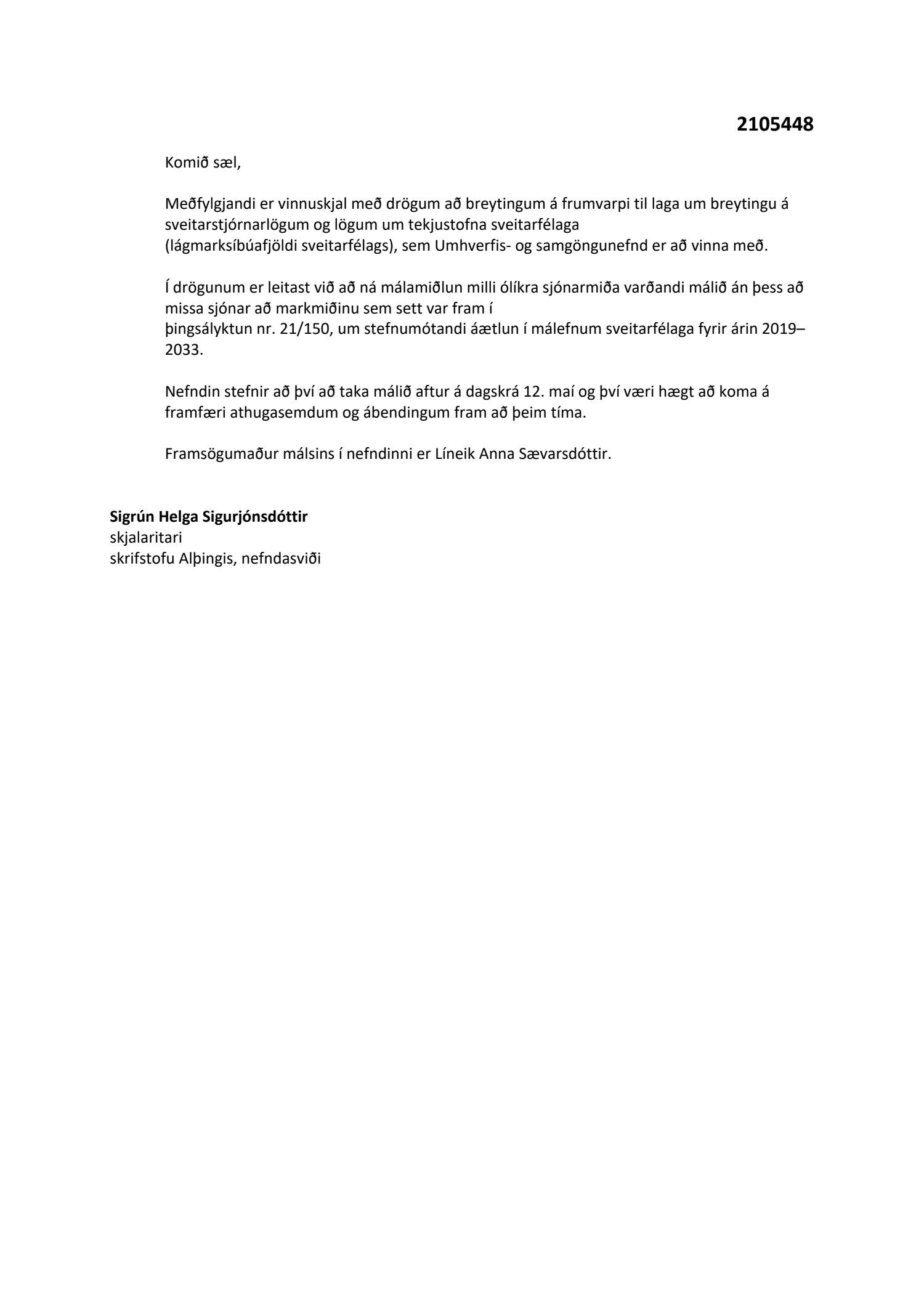 Erindi frá umhverfis- og samgöngunefnd Alþingis, dags. 4. maí, þar sem sent var vinnuskjal með drögum að breytingum á frumvarpi til laga um breytingu á sveitarstjórnarlögum og lögum um tekjustofna sveitarfélaga (lágmarksíbúafjöldi sveitarfélags), 378. mál.