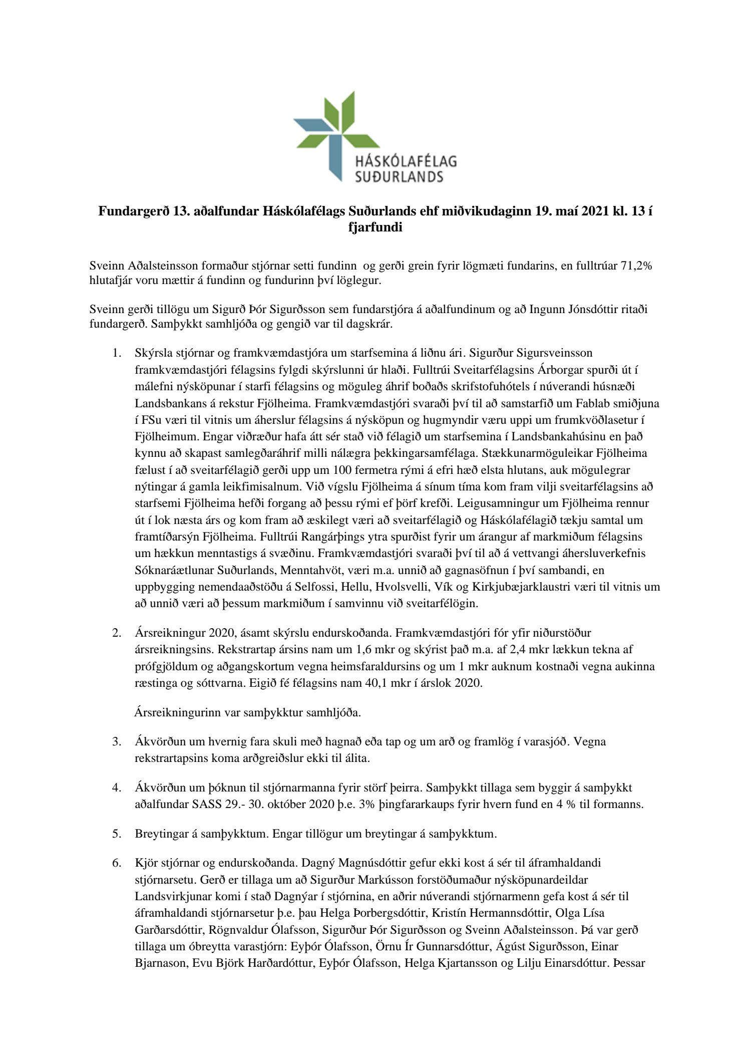Aðalfundur Háskólafélags Suðurlands ehf. 2021