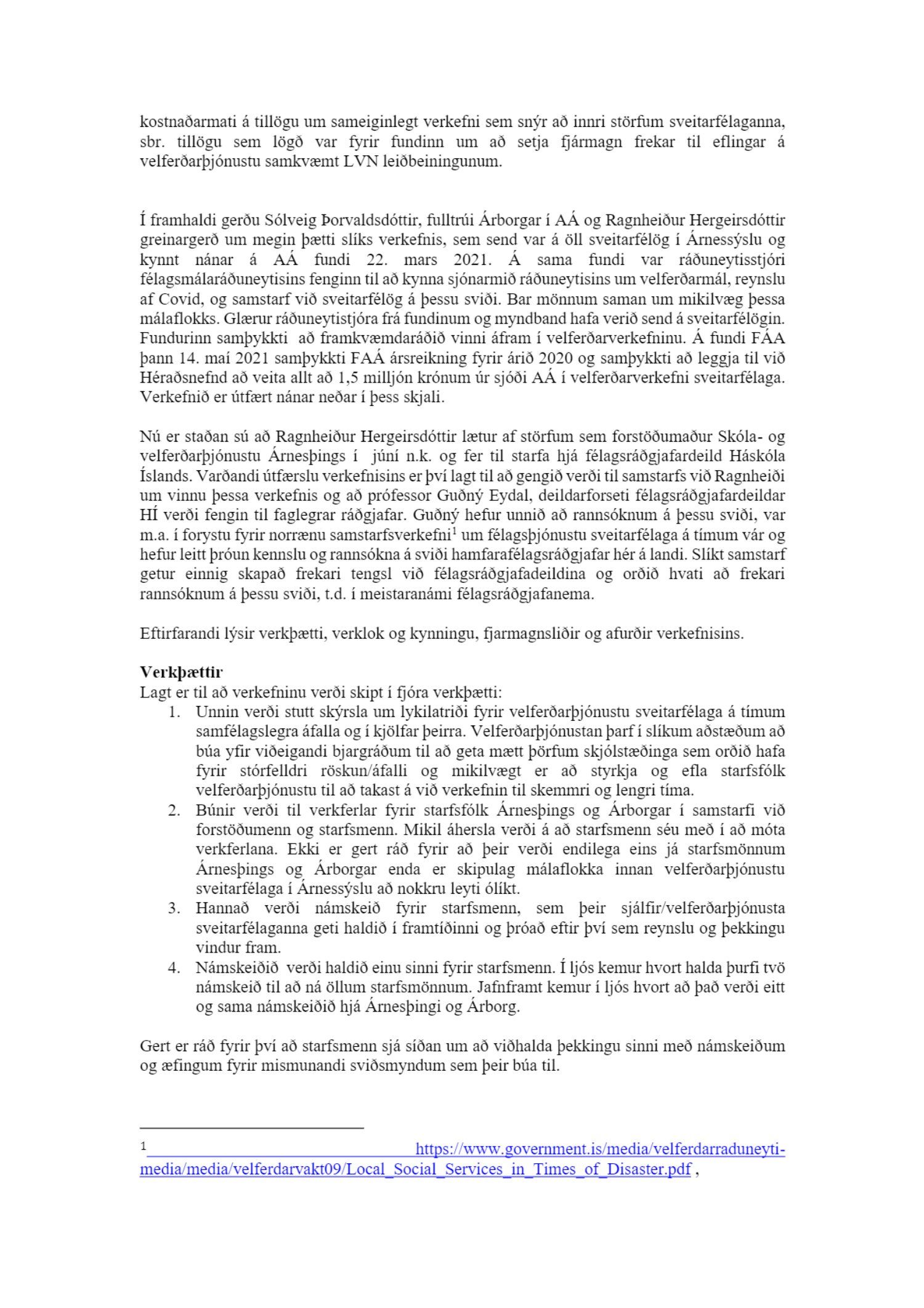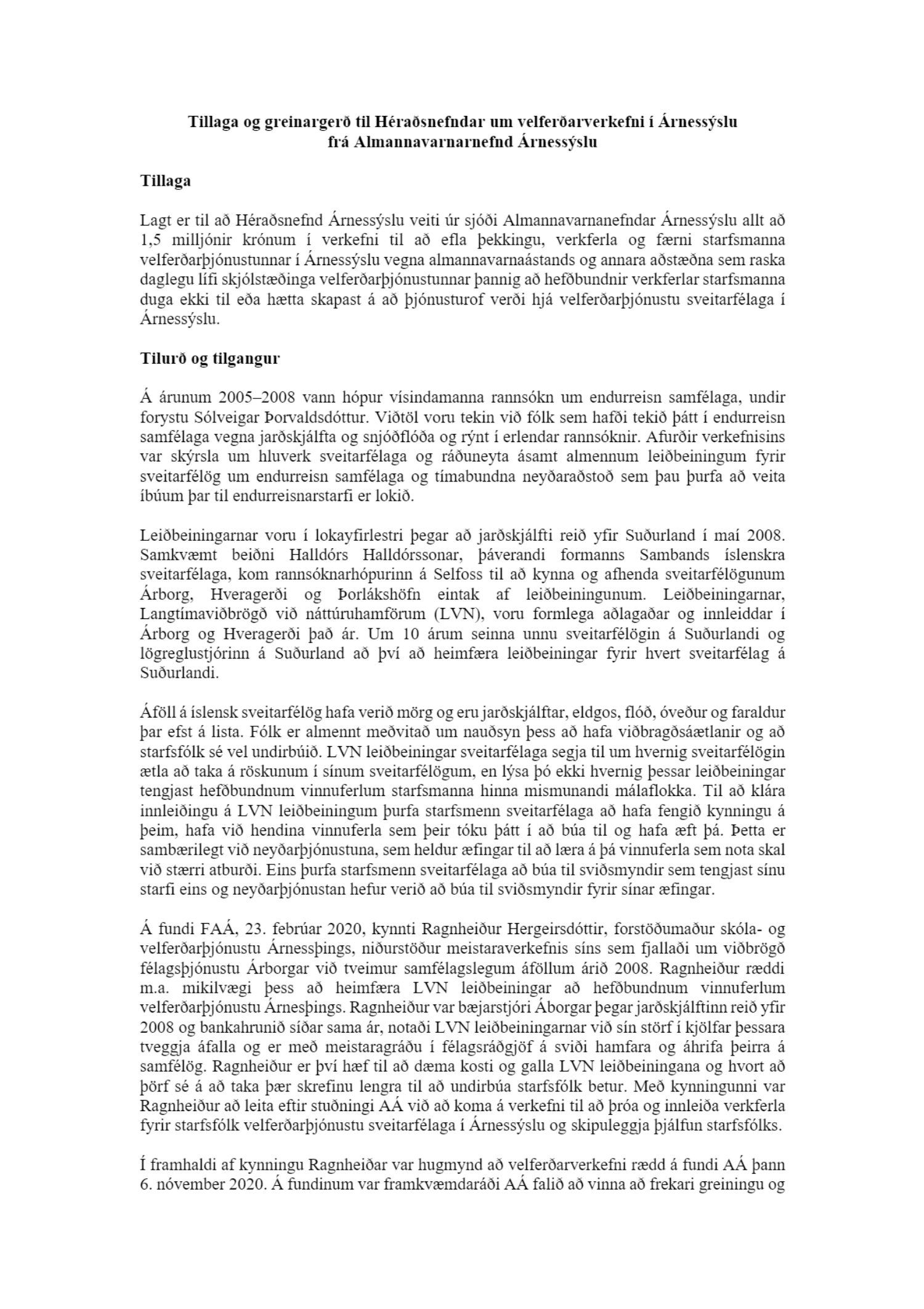 velferðarverkefni í Árnessýslu. Verkefnið er að efla þekkingu, verkferla og færni starfsmanna veðferðarþjónustunnar í Árnessýslu vegna almannavarnaástands og annara aðstæðna sem raska daglegu lífi skjólstæðinga velferðarþjónustunnar þannig að hefðbundnir verkferlar starfsmanna duga ekki til eða hætta skapast á að þjónusturof verði hjá velferðarþjónustu sveitarfélaga í Árnessýslu. Tillagan var borin undir atkvæði og samþykkt samhljóða.