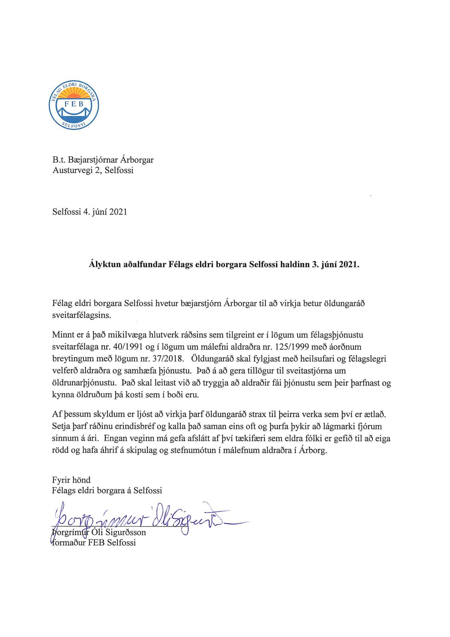 Ályktun aðalfundar Félags eldri borgara Selfossi sem haldinn var 3. júní sl.