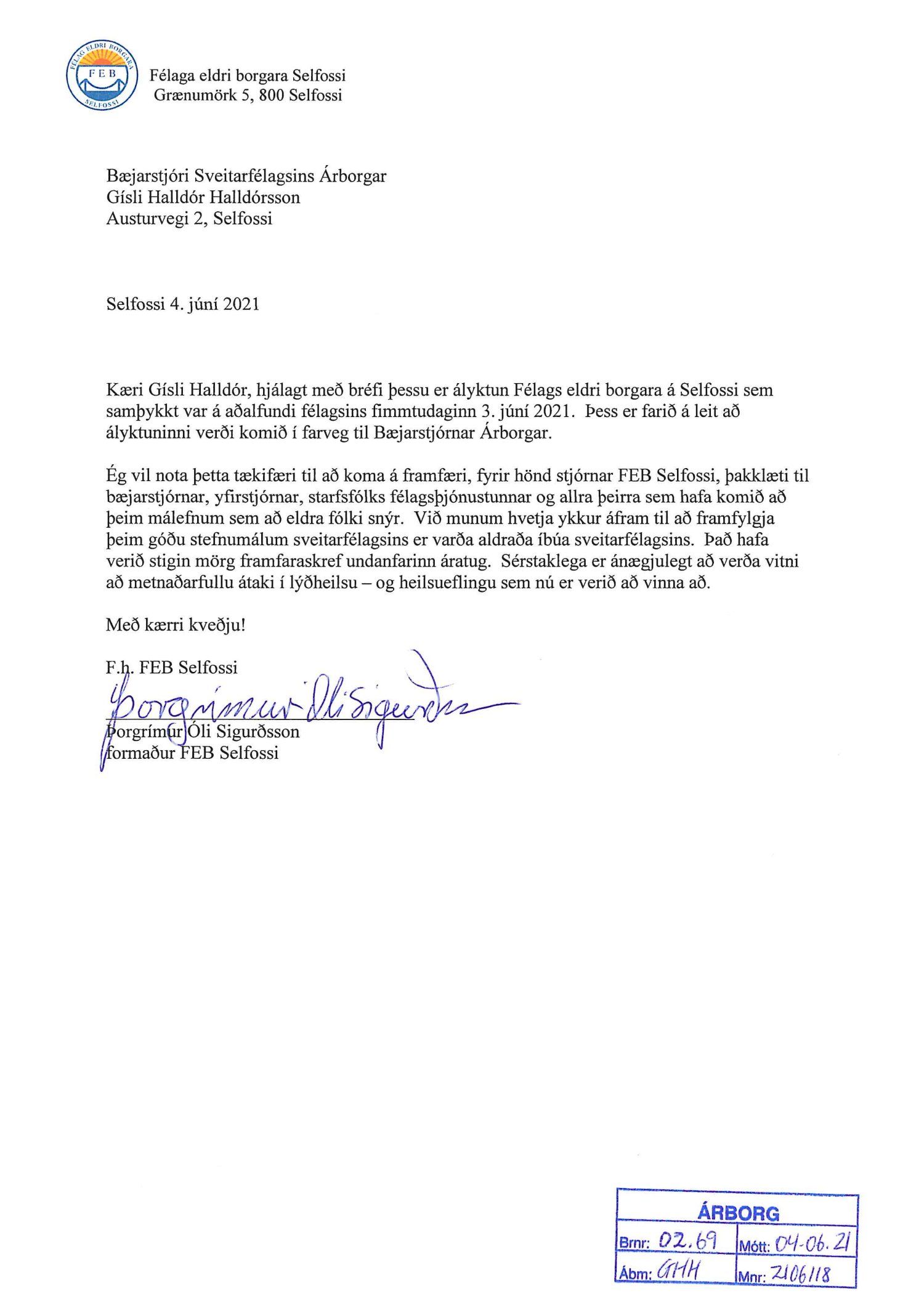 Bæjarráð þakkar góð orð og þá hvatningu sem felst í ályktun Félags eldri borgara á Selfossi. Bæjarráð tekur undir ályktun Félags eldri borgara um eflingu starfsemi Öldungaráðs Árborgar.