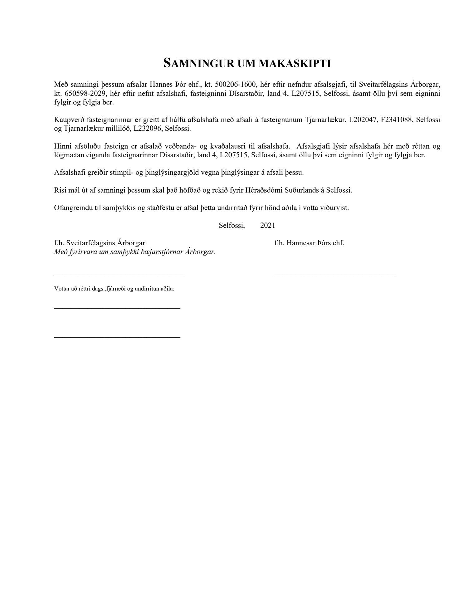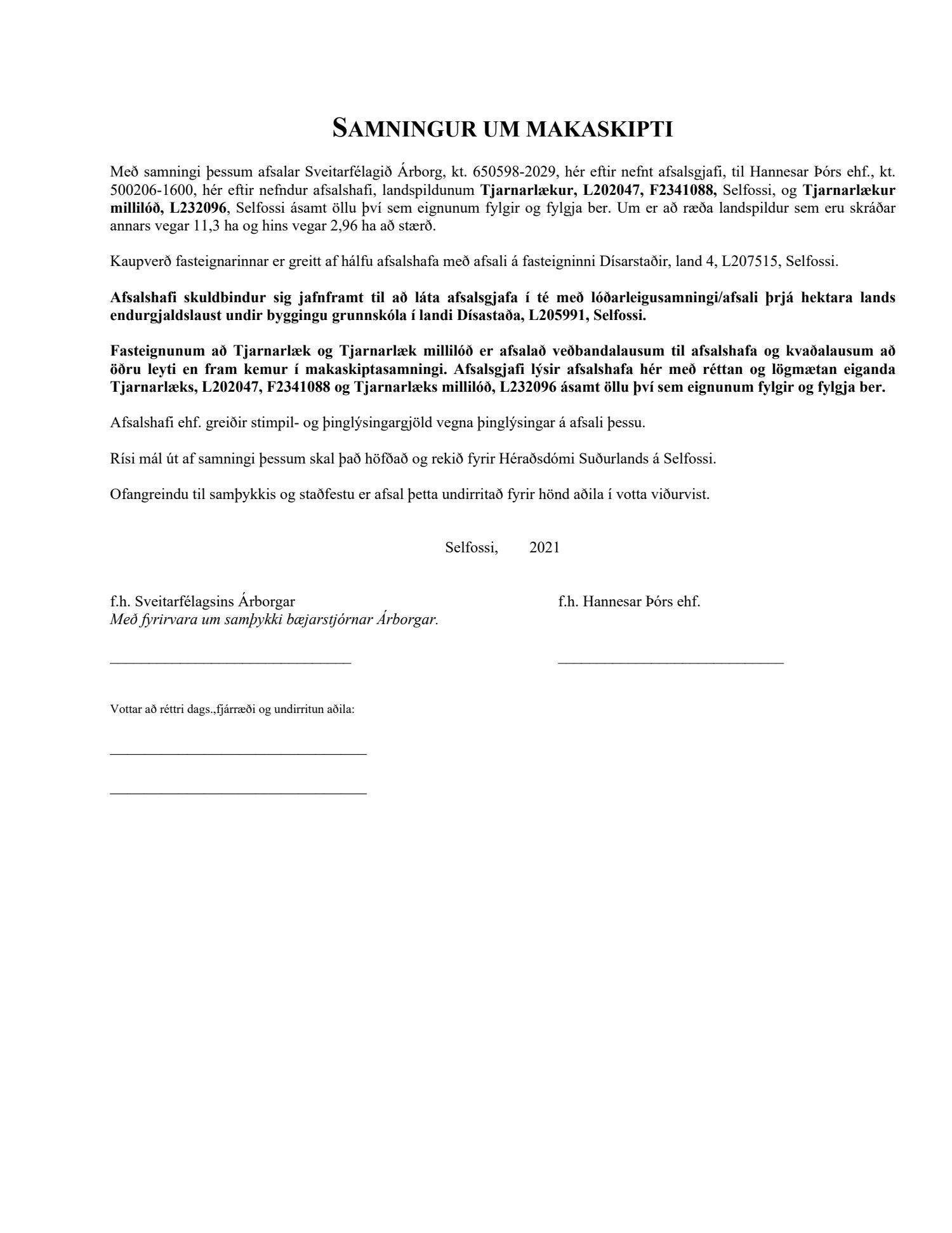 Bæjarráð samþykkir framlagt samkomulag milli Sveitarfélagsins Árborgar og Hannesar Þórs ehf. um makaskipti á lóðunum Tjarnalæk L202047, Tjarnalæk millilóð L232096 og Dísarstaði L205991.