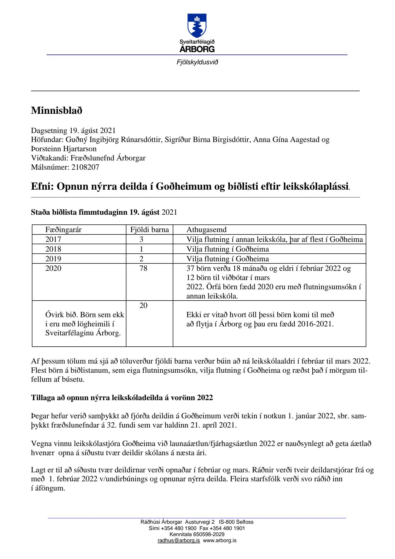 Minnisblað um biðlista og tillaga að opnun nýrra leikskóladeilda. Fræðslunefnd tók undir tillöguna, sem kemur fram í minnisblaðinu, um opnun nýrra deilda í Goðheimum og vísaði því til fjárhagsáætlunargerðar sveitarfélagsins.