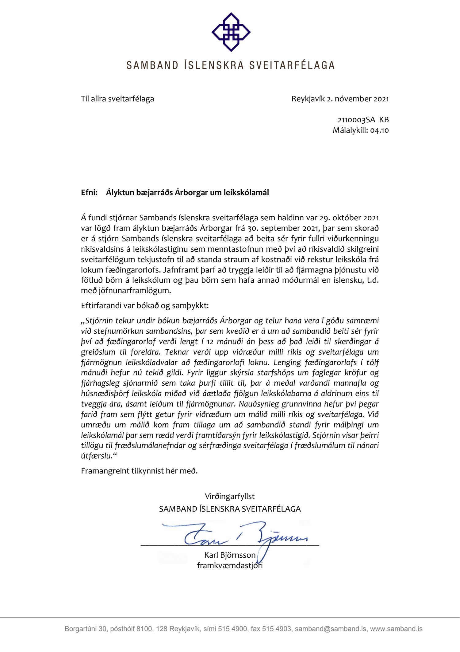 Svar frá Sambandi íslenskra sveitarfélaga, dags. 2. nóvember, um ályktun bæjarráðs Árborgar um leikskólamál.