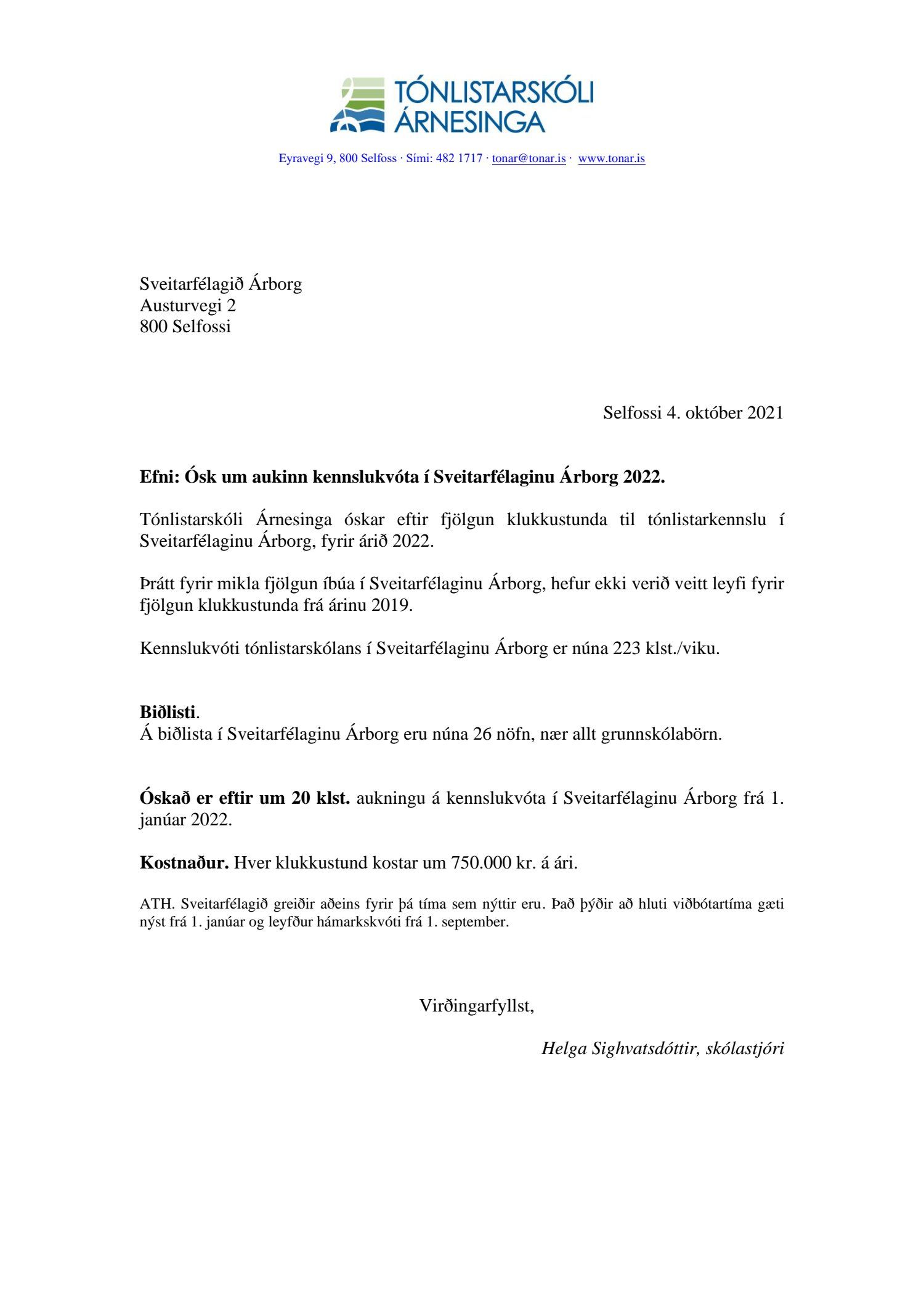 Bæjarráð leggur til að beiðni um aukinn kennslukvóta verði tekin til skoðunar við vinnslu fjárhagsáætlunar 2022.