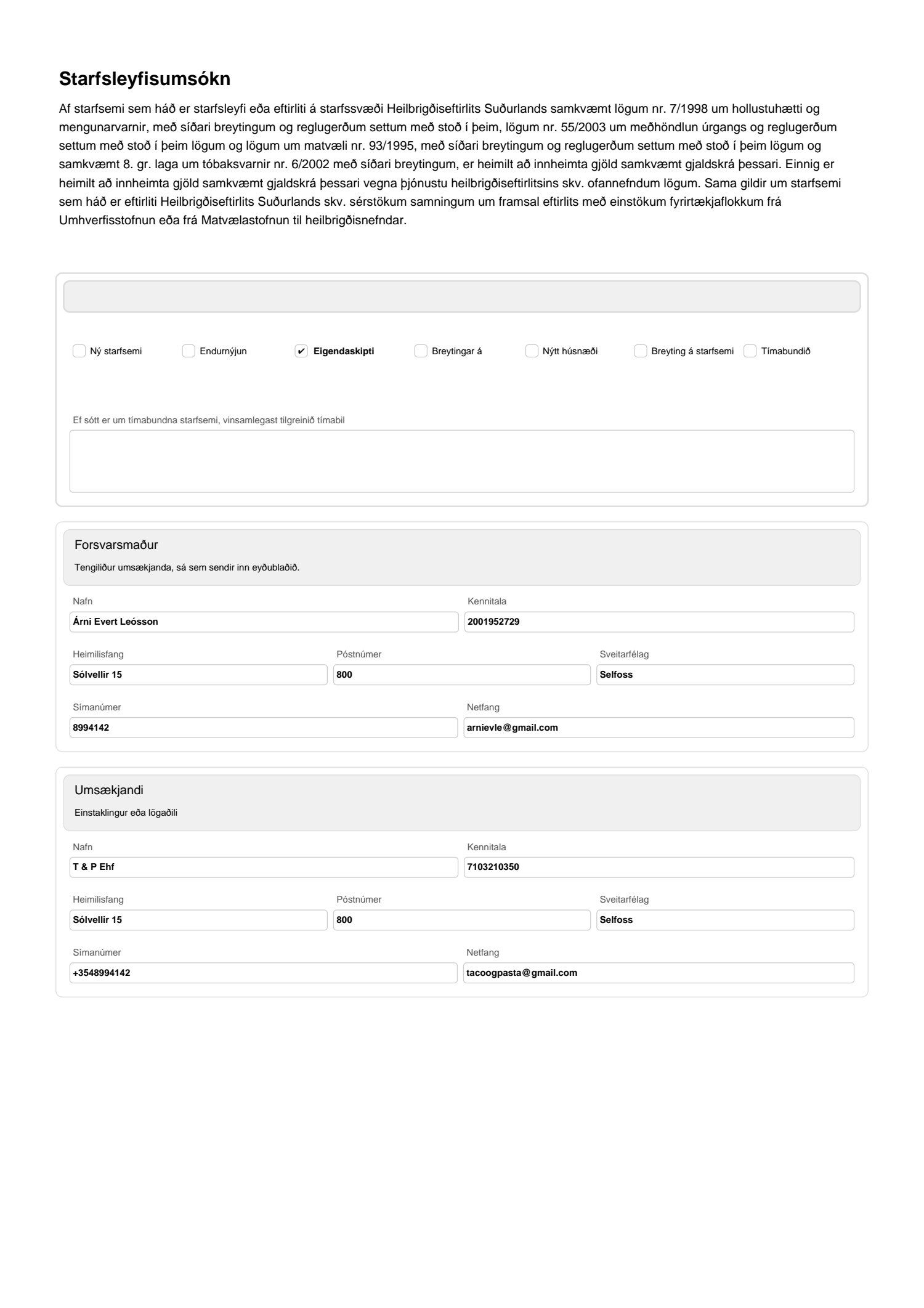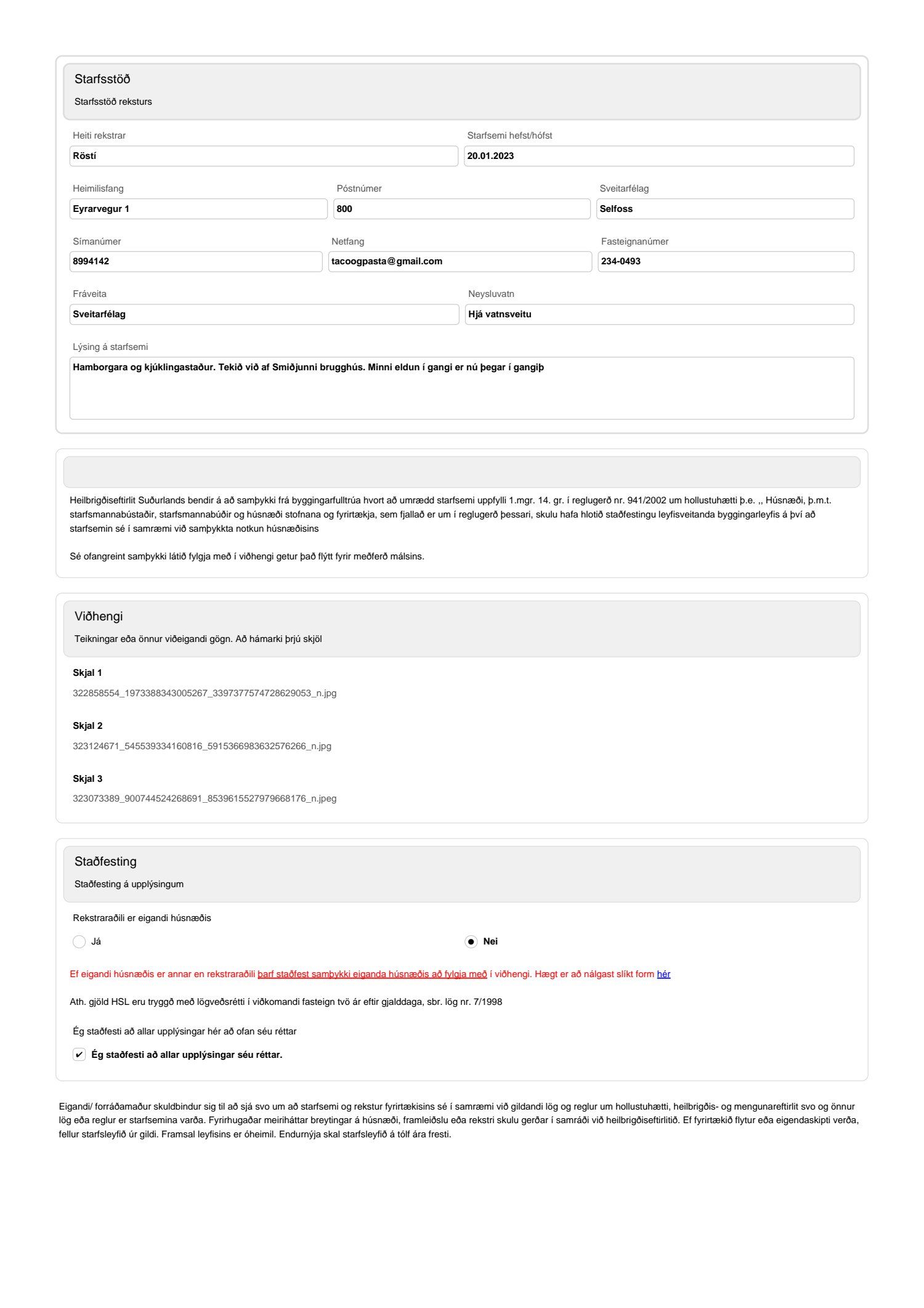 Heilbrigðiseftirlit Suðurlands óskar eftir umsögn vegna starfsleyfisumsóknar T & P ehf. vegna reksturs Röstí veitingastaðar í Mathöllinni á Selfossi.