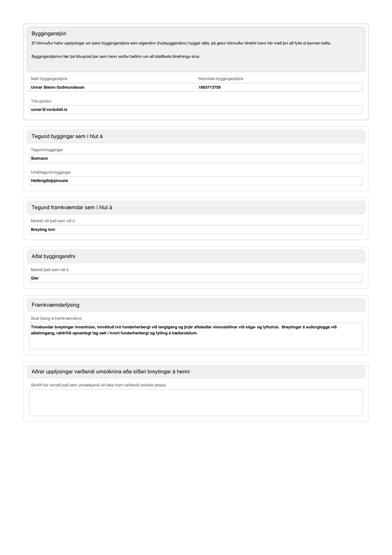 - Aðaluppdrættir, leiðréttir og undirritaðir af hönnuði og staðfestir af byggingarfulltrúa.