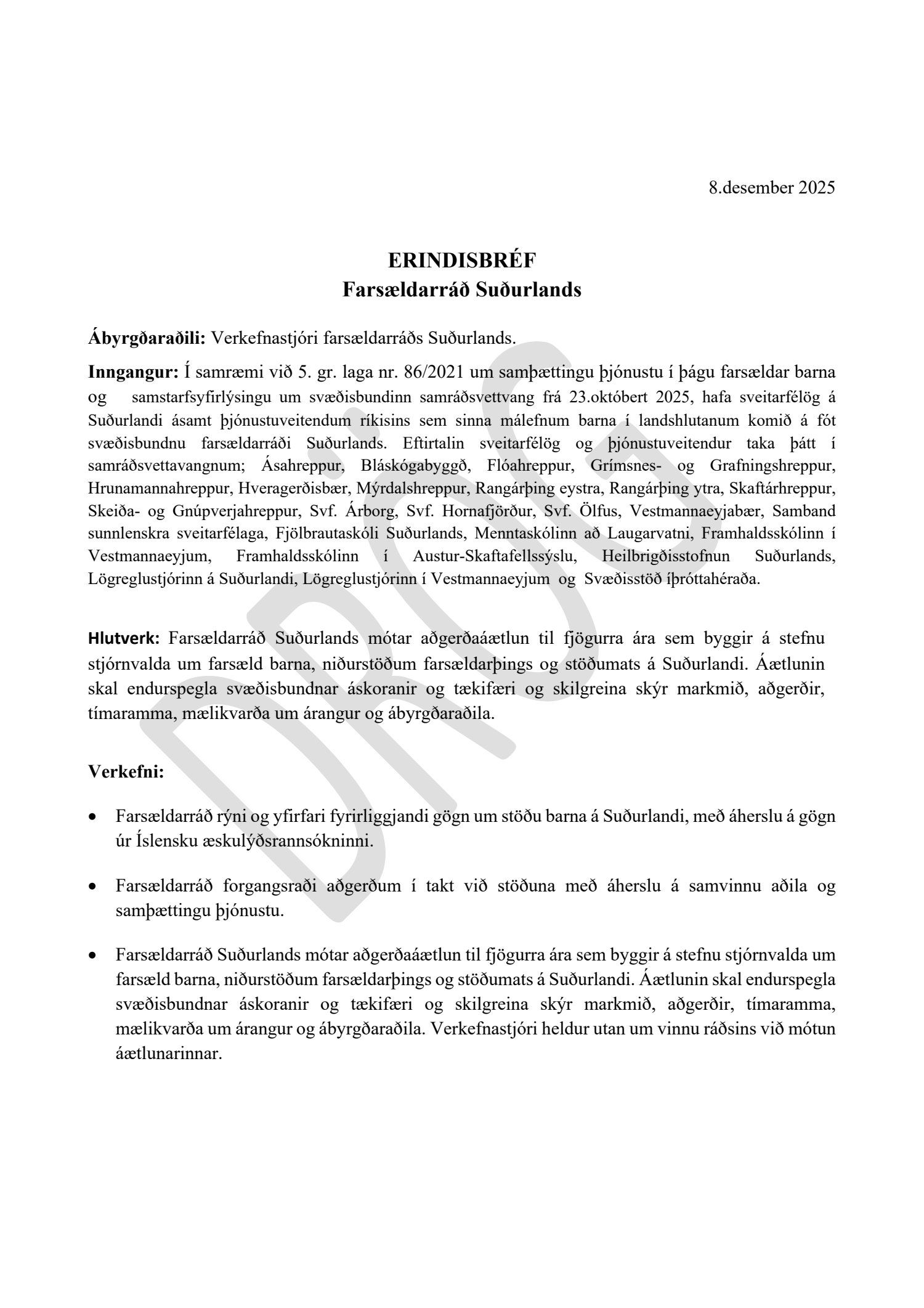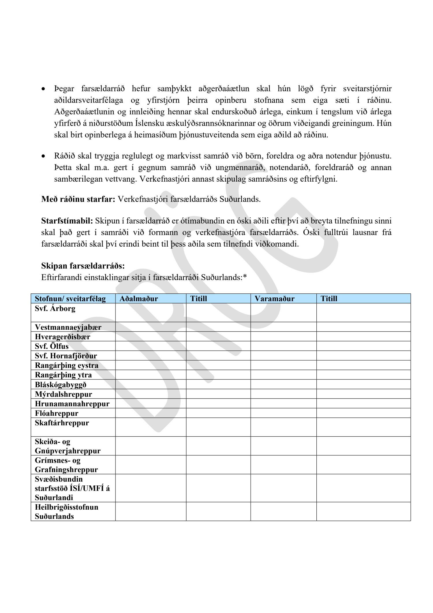 Bæjarráð samþykkir að fulltrúar Sveitarfélagsins Árborgar í farsældarráði Suðurlands verði Heiða Ösp Kristjánsdóttir, sviðstjóri fjölskyldusviðs sem aðalmaður og Sigþrúður Birta Jónsdóttir, deildarstjóri velferðarþjónustu sem varamaður.Samþykkt