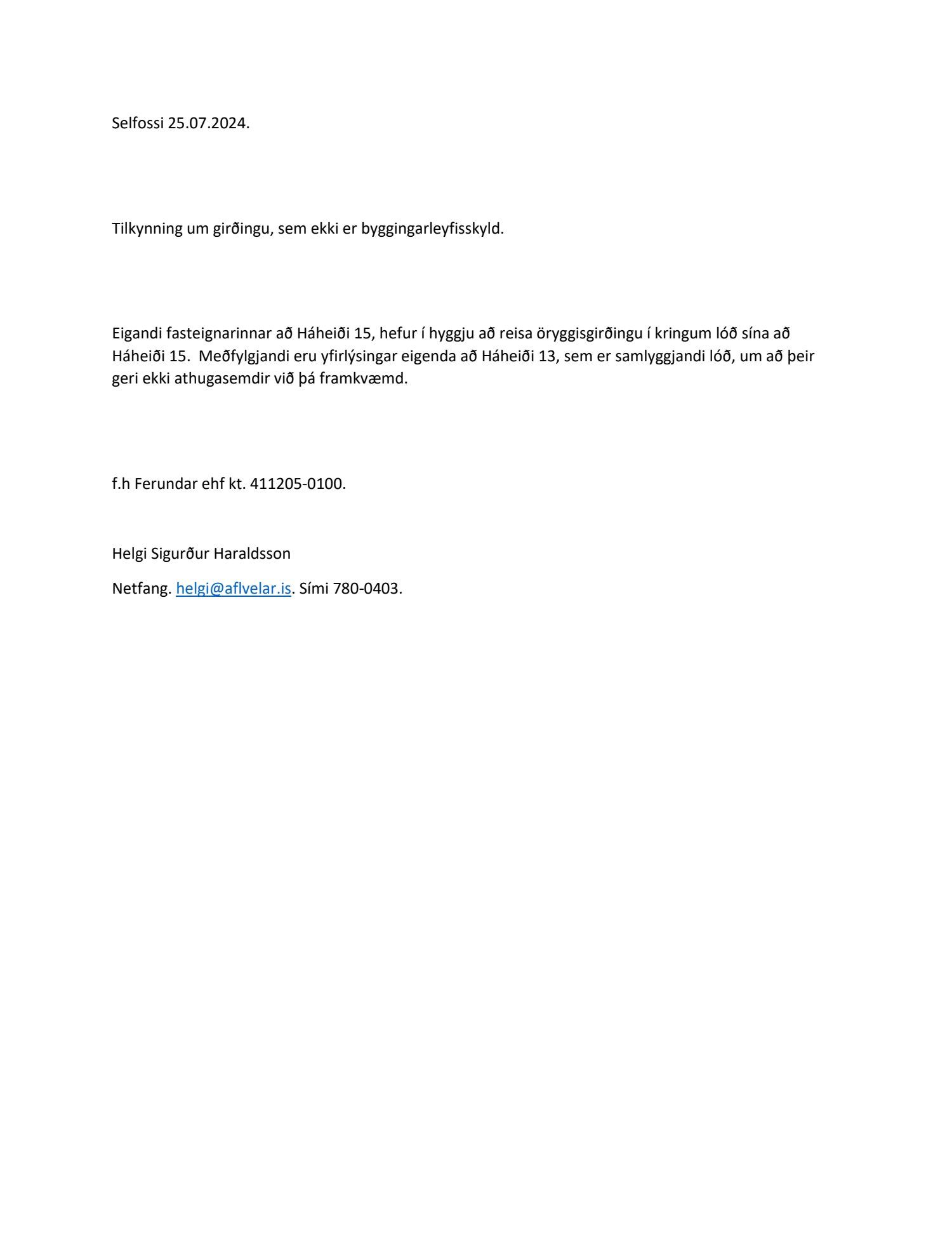 Byggingarfulltrúi gerir ekki athugasemdir við áformin enda liggur fyrir samþykki eigenda nágranna lóðar.Samþykkt