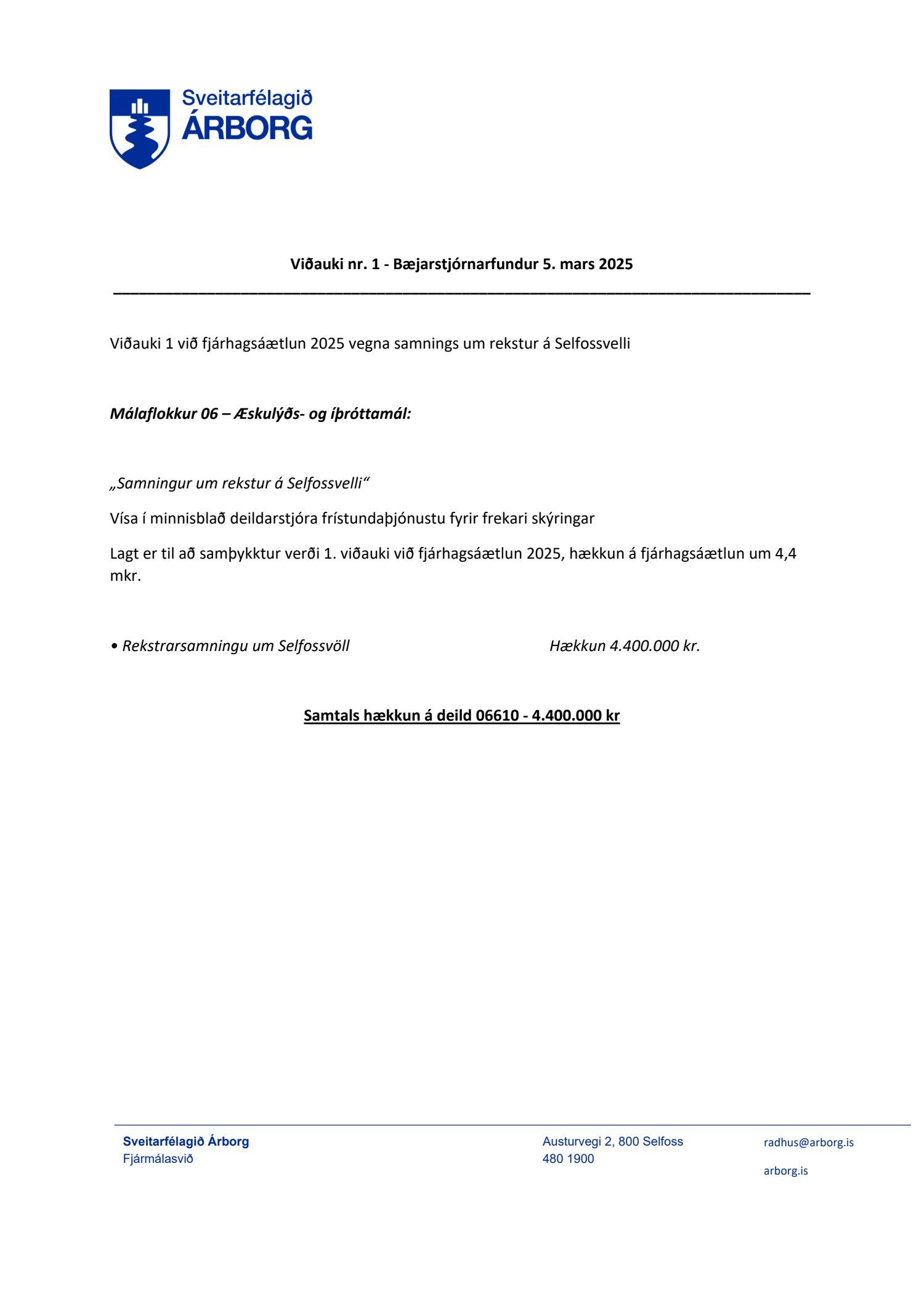 Bæjarráð leggur til við bæjarstjórn að samþykkja viðauka nr. 1 við fjárhagsáætlun Sveitarfélagsins Árborgar 2025 vegna hækkunar á rekstrarsamningi um Selfossvöll, til að mæta hækkun rekstrarkostnaðar. Áhrif viðaukans á rekstrarniðurstöðu samstæðu sveitarfélagsins Árborgar er kr. 4.400.000,-.