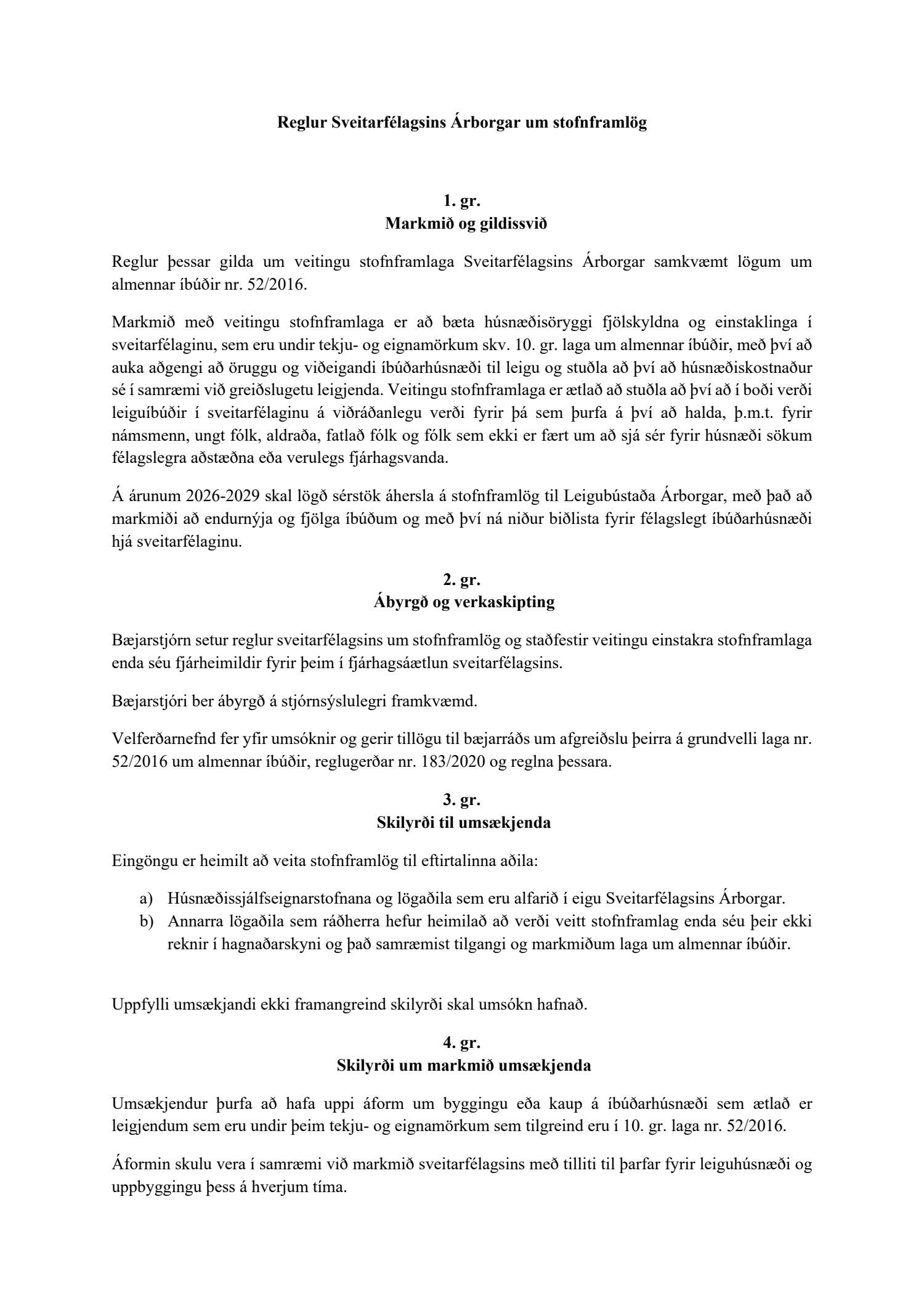 Lögð fram drög að reglum um stofnframlög fyrir Sveitarfélagið Árborg. Bæjarráð samþykkir fyrir sitt leyti reglur um stofnframlög og leggur til við bæjarstjórn að samþykkja reglurnar.