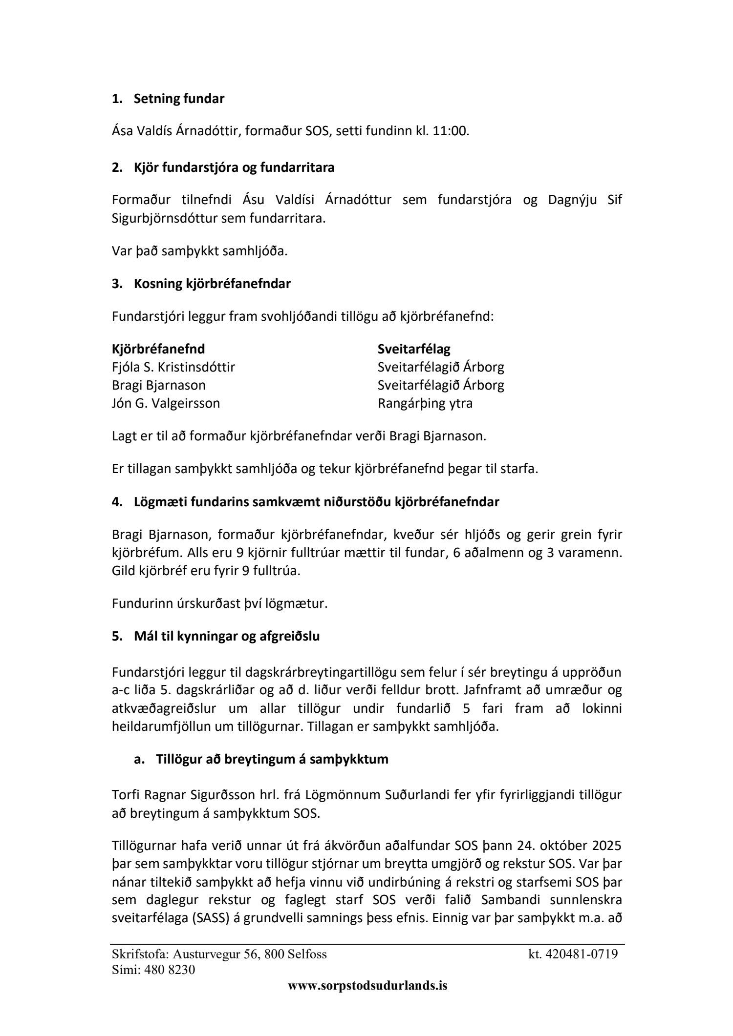 Tillaga stjórnar um breytingar á samþykktum SOS skv. a. lið 5. dagskrárliðar fundarins er borin undir atkvæði og samþykkt samhljóða og samþykktunum vísað til staðfestingar sveitarstjórna aðildarsveitarfélaga SOS sem taka þurfa breyttar samþykktir fyrir í tveimur umræðum áður en þær eru birtar í B-deild Stjórnartíðinda.