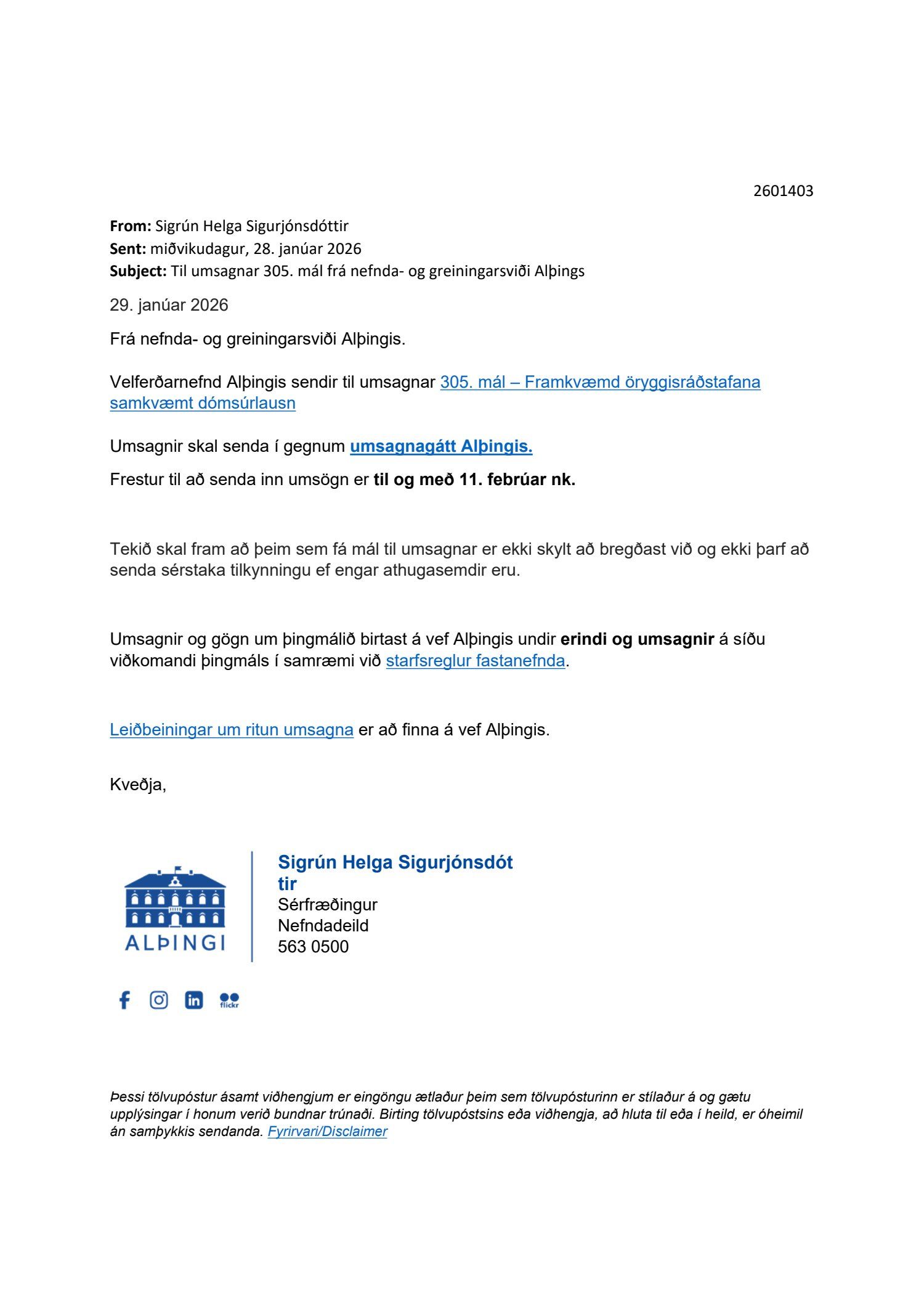 Erindi frá Alþingi dags. 29. janúar, þar sem óskað er eftir umsögn um frumvarp til laga um framkvæmd öryggisráðstafana samkvæmt dómsúrlaus.
