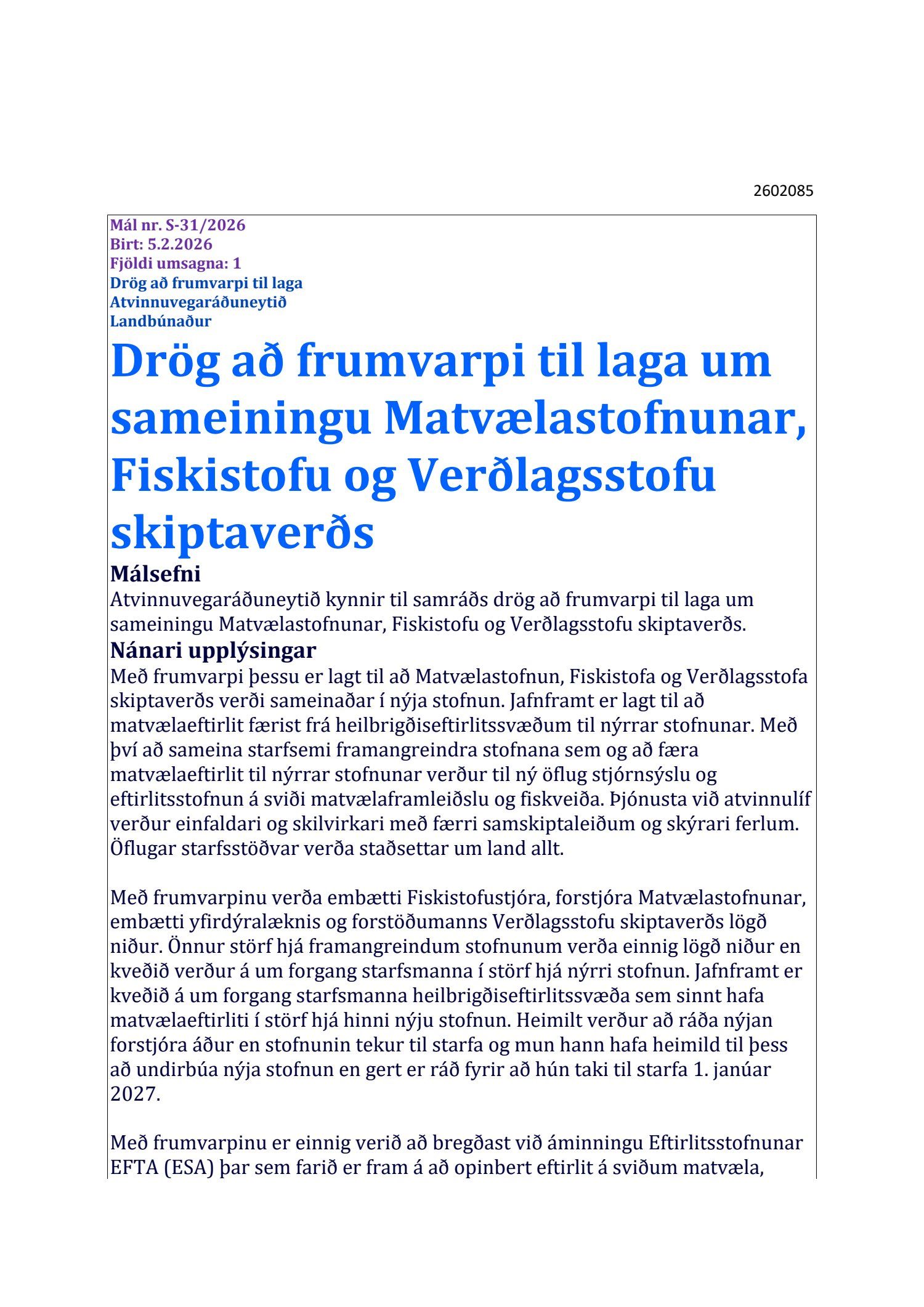 Erindi frá atvinnuvegaráðuneytinu dags. 5. febrúar, þar sem kynnt er til samráðs mál nr.S-31/2026. Drög að frumvarpi til laga um sameiningu Matvælastofnunar, Fiskistofu og Verðlagsstofu skiptaverð. Umsagnarfrestur er til 20. febrúar nk.