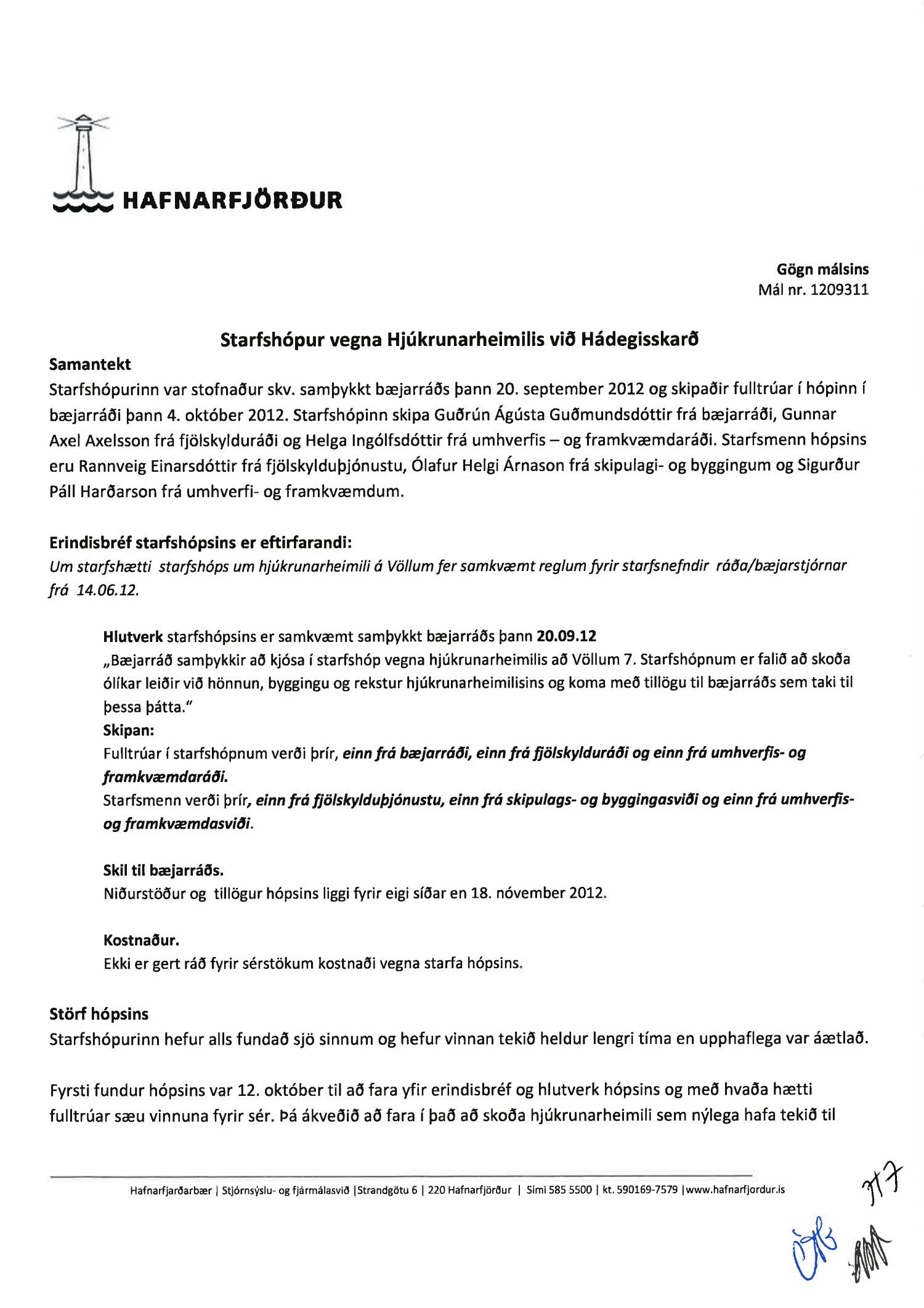Bæjarráð samþykkir fyrirliggjandi tillögu starfshópsins og felur bæjarstjóra að leita tilnefninga í verkefnastjórn um byggingu og rekstur hjúkrunarheimilis við Hádegisskarðs sbr. fyrirliggjandi drög að erindisbréfi og undirbúa störf verkefnastjórnar.