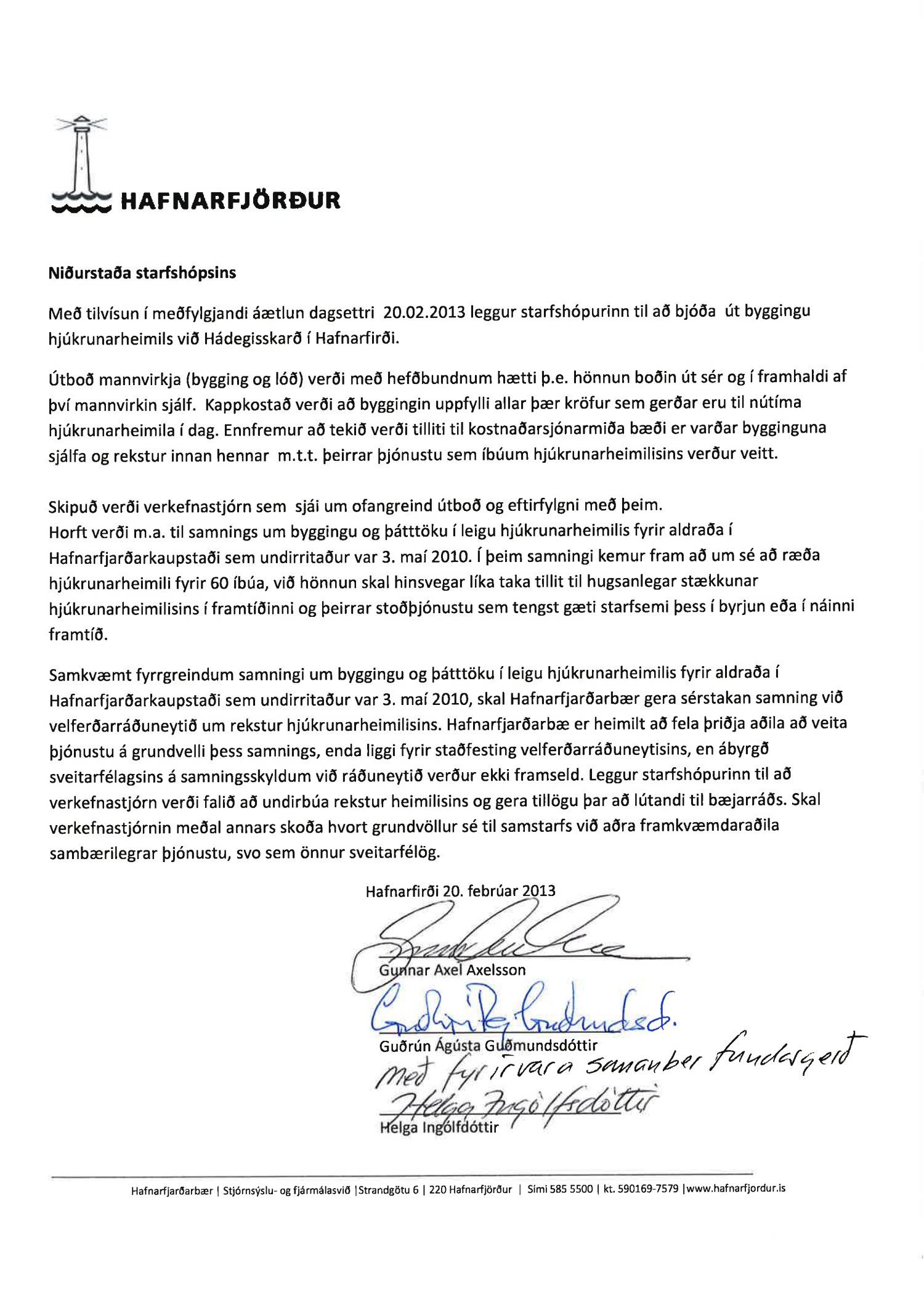 "Bæjarráðsfulltrúar Sjálfstæðisflokksins samþykkja fram komna tillögu starfshóps, um að stofnuð verði verkefnastjórn sem undirbúi útboðsferli vegna byggingar nýs hjúkrunarheimilis, en gert er ráð fyrir að eftirfarandi atriði liggi jafnframt fyrir hið fyrsta: