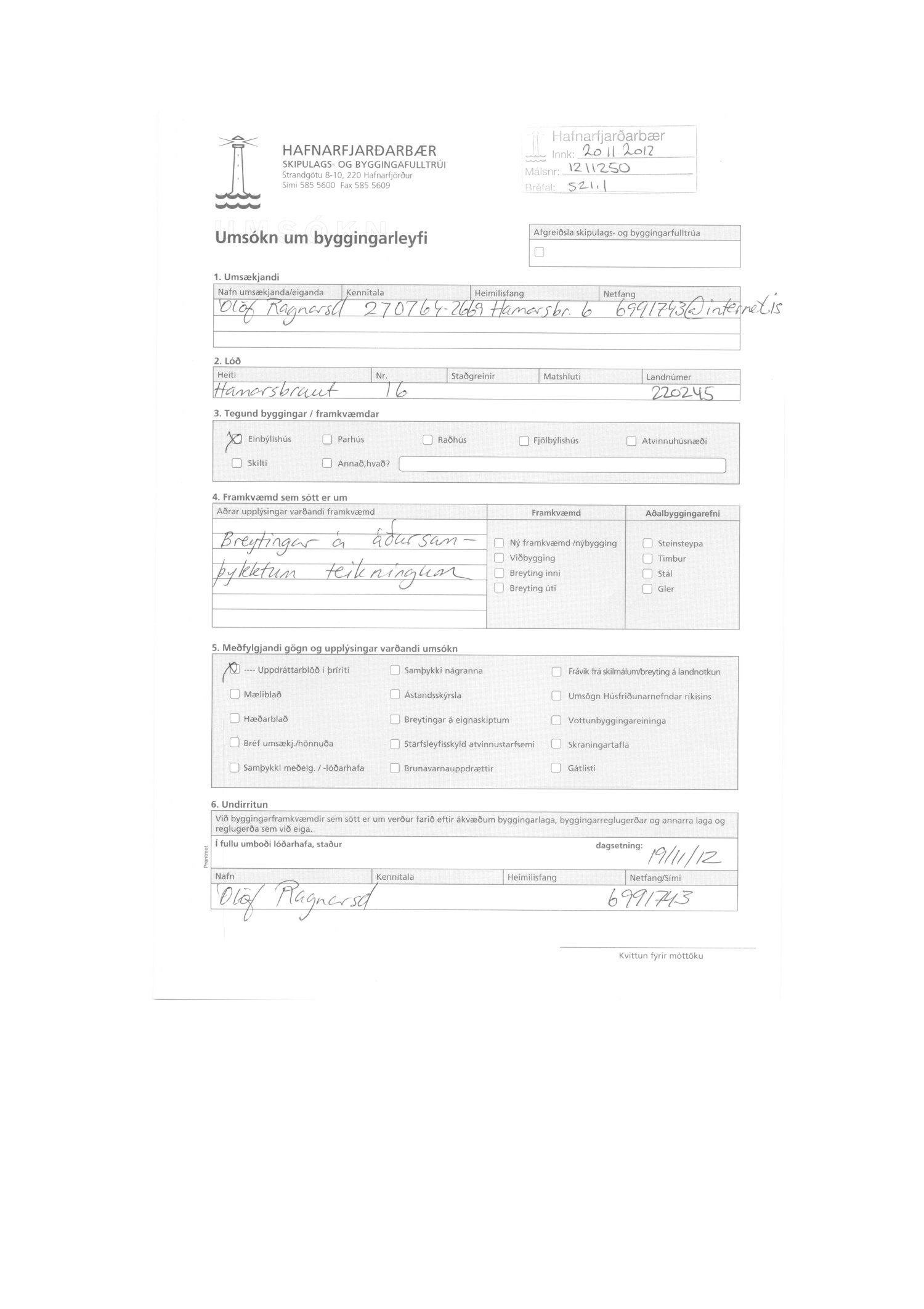 Ólöf Ragnarsdóttir sækir þann 19.11.2012 um leyfi fyrir breytingu á áður samþykktum teikningum dagst.19.09.2011.
