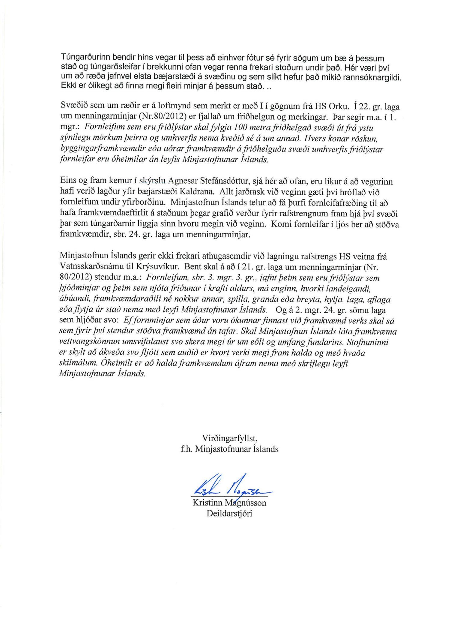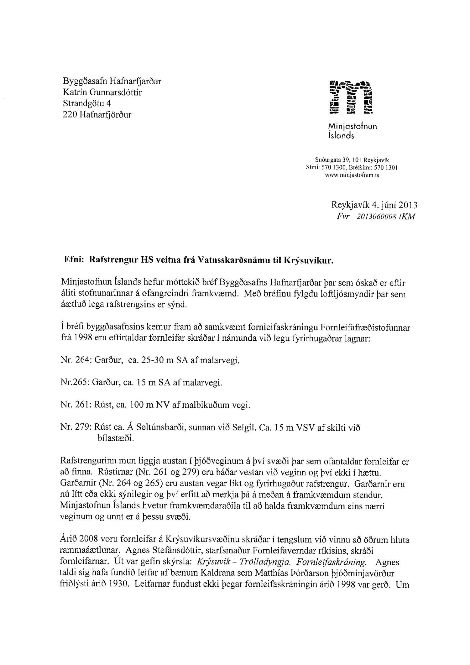 Skipulags og byggingarráð samþykkir umbeðið framkvæmdaleyfi og felur skipulags- og byggingarfulltrúa endanlega afgreiðslu þess. Skipulags- og byggingarráð tekur undir umsögn Minjastofnunar varðandi lagningu rafstrengs HS veitna frá Vatnsskrarðsnámu til Krýsuvíkur og gerir þann fyrirvara um veitingu framkvæmdaleyfisins. Eins og fram kemur í áliti Minjastofnunar frá 4. júní 2013, mun vegurinn liggja austan í þjóðveginum nálægt því svæði sem fornleifar eru að finna og eru framkvæmdaraðilar hvattir til að halda framkvæmdum eins nærri veginum og unnt er. Þá skyldi gæta sérstaklega að fornminjum/rústum af bænum Kaldrana sem enn hefur ekki fundist en getið er um í rituðum heimildum. Þar sem hætta er á að raska fornminjum á svæðinu sem kallast I í gögnum HS-Orku er sett það skilyrði að fornleifafræðingur hafi framkvæmdaeftirlit á svæði I. Að öðru leyti er vísað til laga um menningarminjar nr. 80/2012.