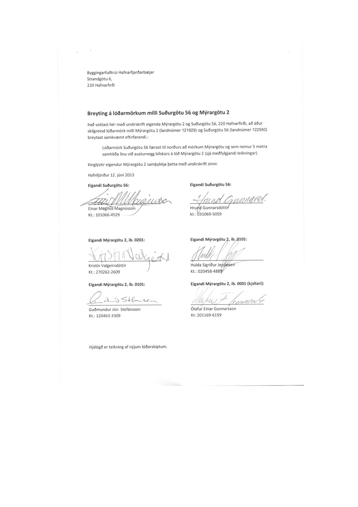 Bæjarráð Hafnarfjarðar í umboði bæjarstjórnar samþykkir að úthluta Hrund Gunnarsdóttur kt. 031069-5059 og Einari Magnúsi Magnússyni kt. 101066-4529 viðbót við lóðina Suðurgata 56 í samræmi við fyrirliggjandi gögn og nánari skilmála skipulags- og byggingarfulltrúa.