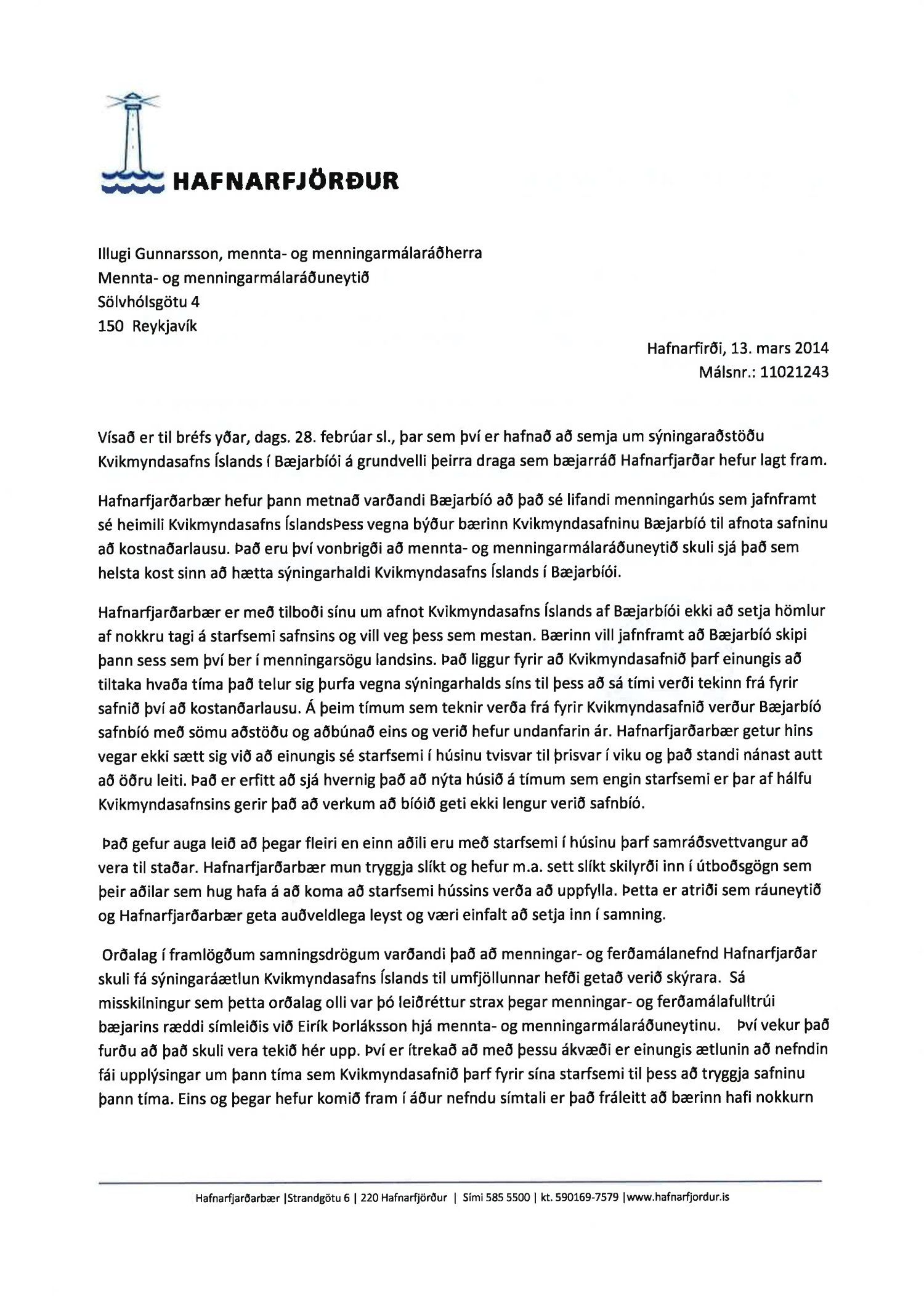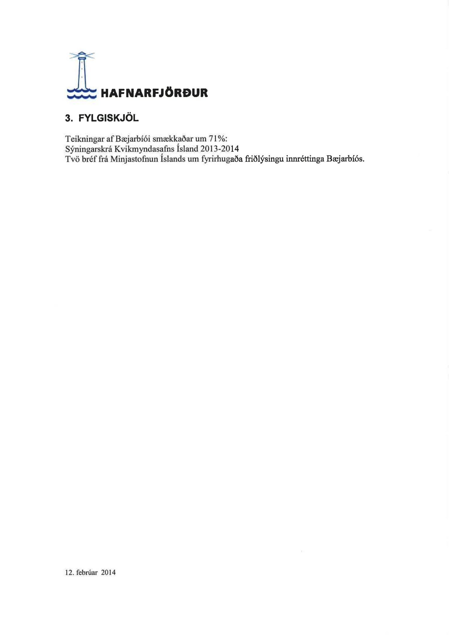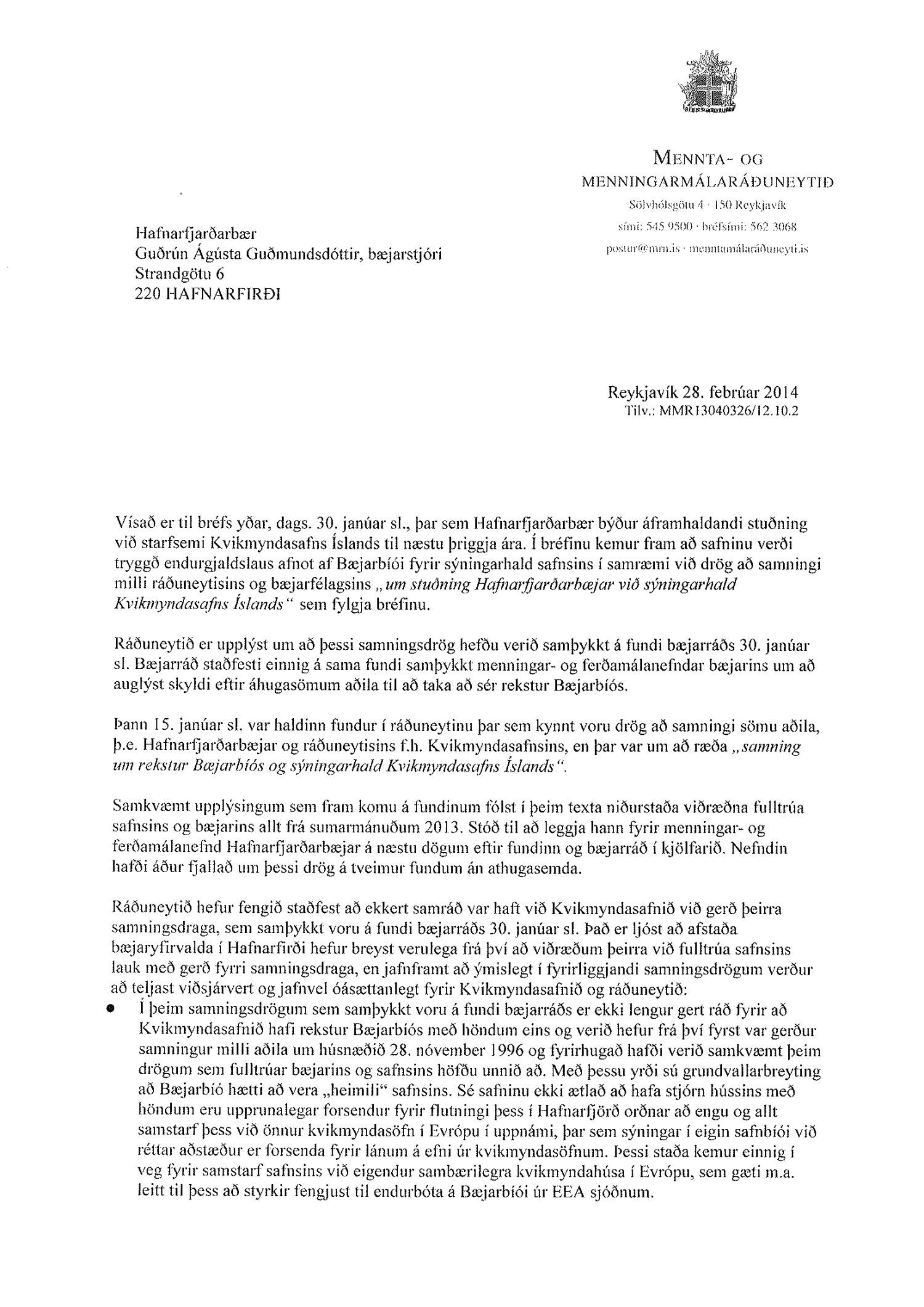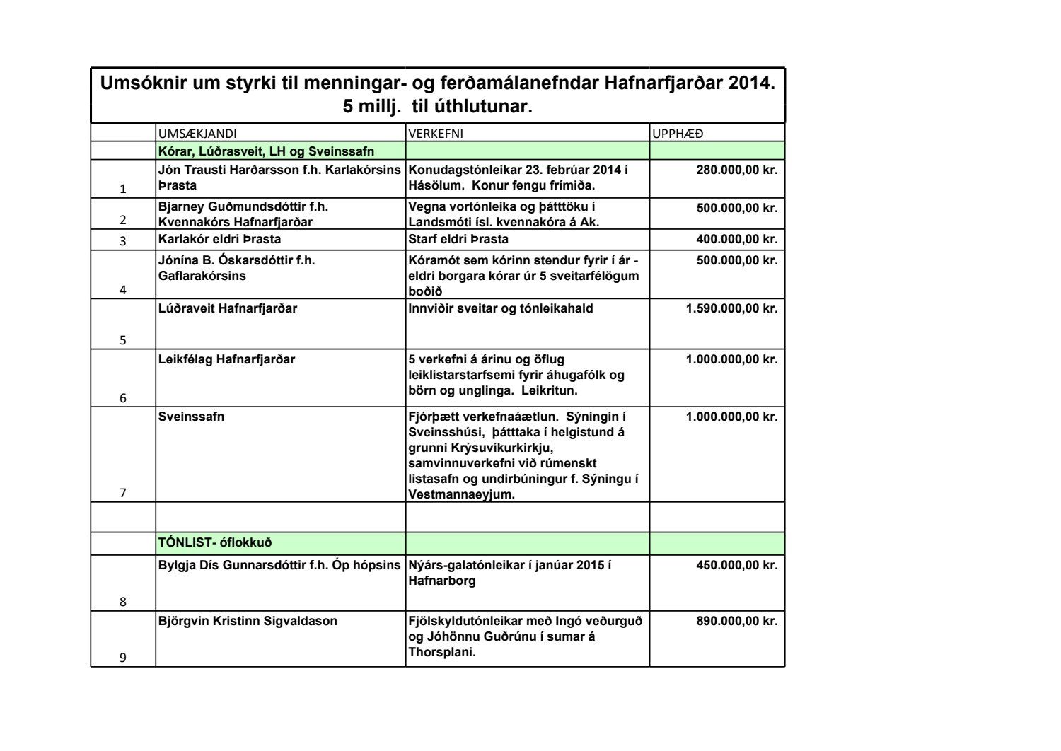 Lagt fram til kynningar. 20.3. 1403010 - Bjartir dagar 2014 Menningar- og ferðamálafulltrúi greindi frá helstu atriðum dagskrár. 20.5. 1009320 - Gaflaraleikhúsið Frestað til næsta fundar. 20.6. 1309278 - Bæjarlistamaður og hvatningarstyrkir 2014 Fundað með stjórn Hafnarborgar. Farið yfir þær ábendingar og tillögur sem bárust. Ákveðið samhljóða hver skuli útnefndur bæjarlistamaður og hvaða tveir listamenn hljóti hvatningarstyrki. Upplýst verður um valið síðasta vetrardag, þann 23. apríl n.k.