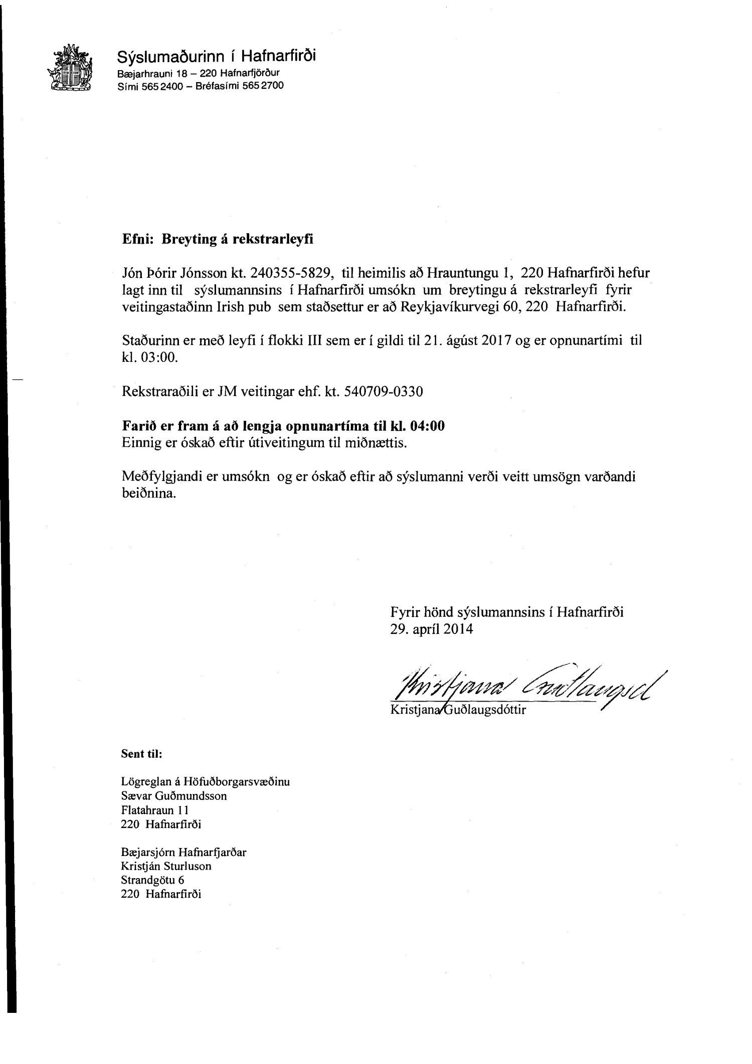 Lagt fram erindi Sýslumannsins í Hafnarfirði dags. 29. apríl 2014 þar sem óskað er eftir umsögn Hafnarfjarðarbæjar um heimild til að lengja opnunartíma Irish pub til kl. 04:00,