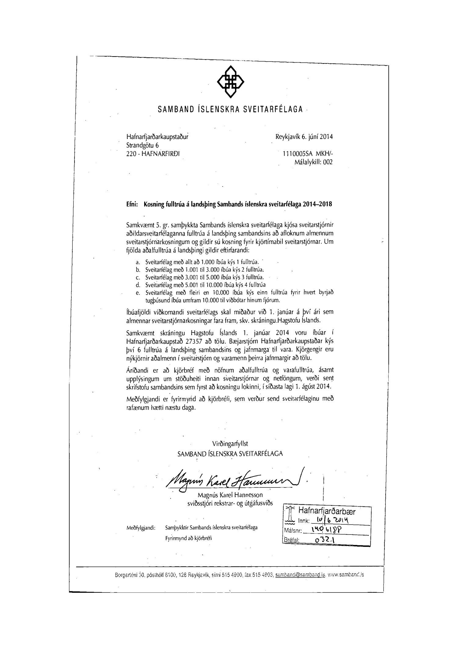 Lagt fram erindi Sambands íslenskra sveitarfélaga dags. 6. júní 2014 varaðndi kosningu fulltrúa á landsþing sambandsins. Hafnarfjarðarbær kýs 6 fulltrúa og jafn marga til vara.