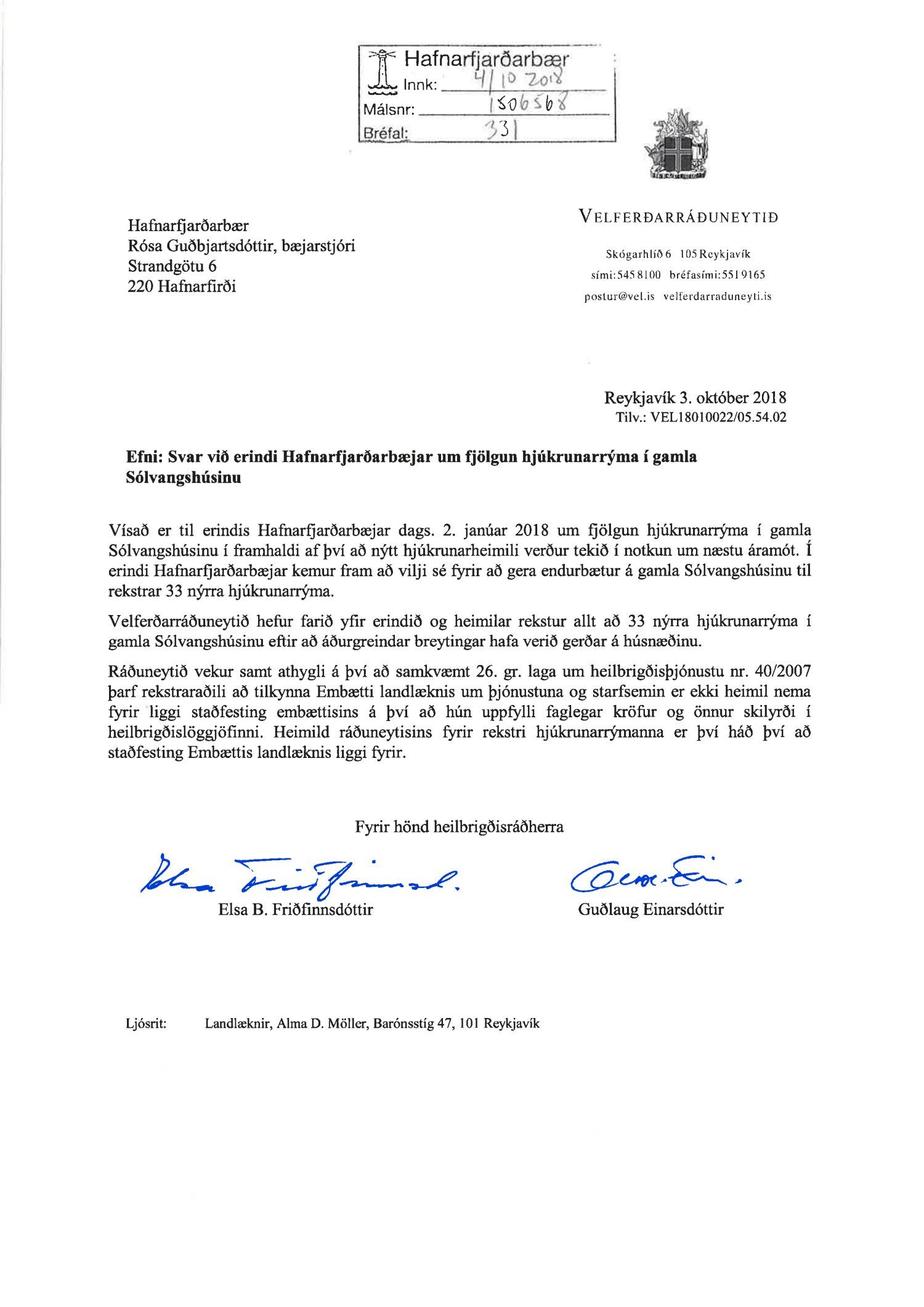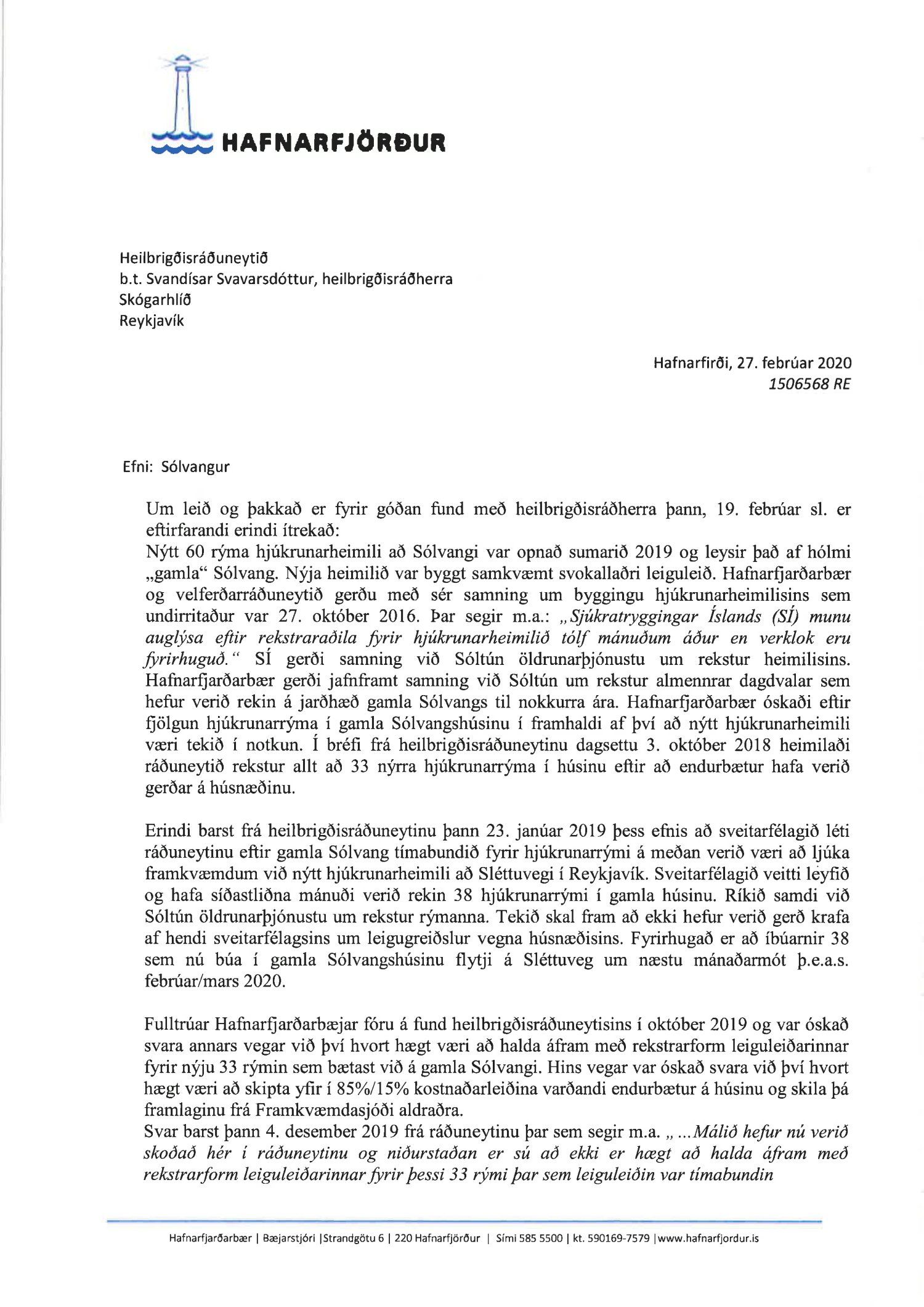 Bæjarstjórn Hafnarfjarðar ítrekar kröfu sína um að farin verði leiguleiðin við endurbætur á „gamla“ Sólvangi ellegar skipt yfir í 85%/15% kostnaðarleiðina. Heilbrigðisráðuneytið hefur samþykkt að 33 ný hjúkrunarrými verði í Hafnarfirði og er sveitarfélagið að leita hagkvæmustu leiða til að koma þeim í notkun sem allra fyrst. Ef ráðuneytið telur fyrrgreindar leiðir við endurbætur ekki færar er óskað eftir því að ráðuneytið komi fram með útfærslu á fjármögnun endurbóta á húsnæði „gamla“ Sólvangs en ljóst er að kostnaður við endurbætur hússins fyrir rýmin 33 er margfalt lægri en ef byggja þyrfti nýtt hjúkrunarheimili frá grunni.