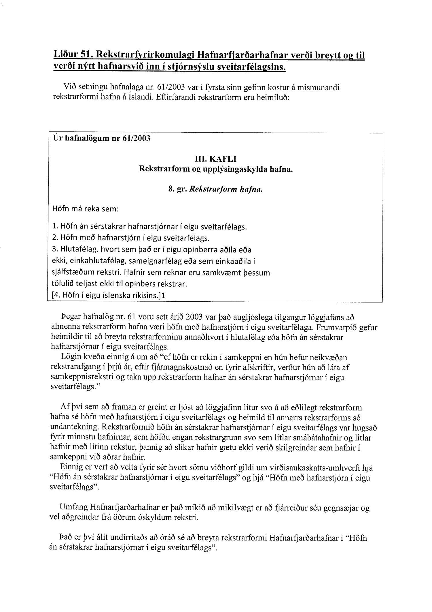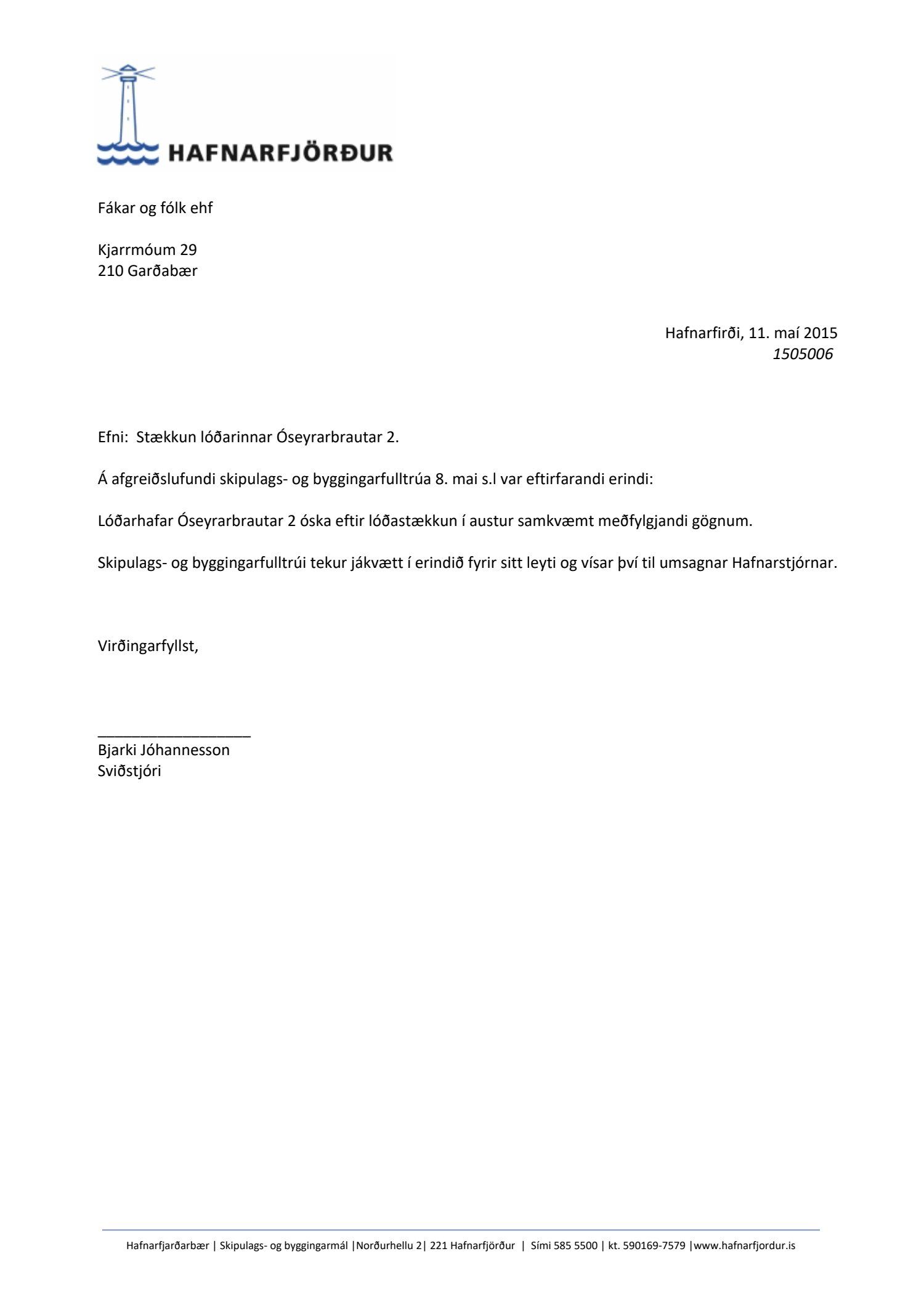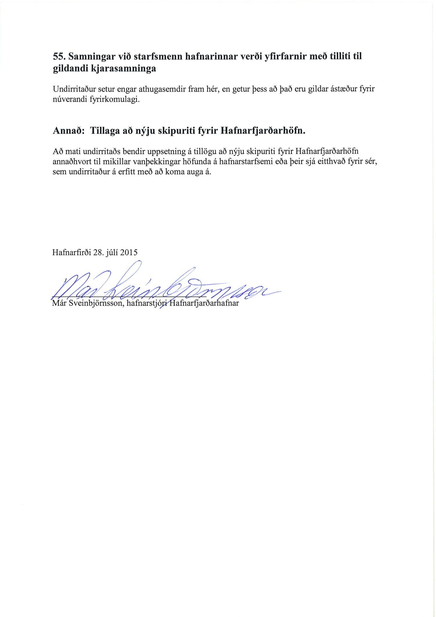 Lagt fram til kynningar. 10.3. 1112128 - Umhverfisstefna Hafnarfjarðarhafnar Ólafur Ingi Tómasson vakti máls á slæmri umgengni sumsstaðar á hafnarsvæðinu, sérstaklega á einstökum lóðum. Hafnarstjóra falið að ræða við viðkomandi lóðarhafa. 10.4. 1208466 - Viðlegugjöld flotkvía, viðræður. Tekið fyrir erindi Vélsmiðju Orms og Víglundar ehf. um viðlegugjöld fyrir flotkvíar frá 7. apríl 2014. Lagt fram. 10.5. 1504475 - Starfsmannamál 2015 Farið yfir starfsmannamál hafnarinnar.