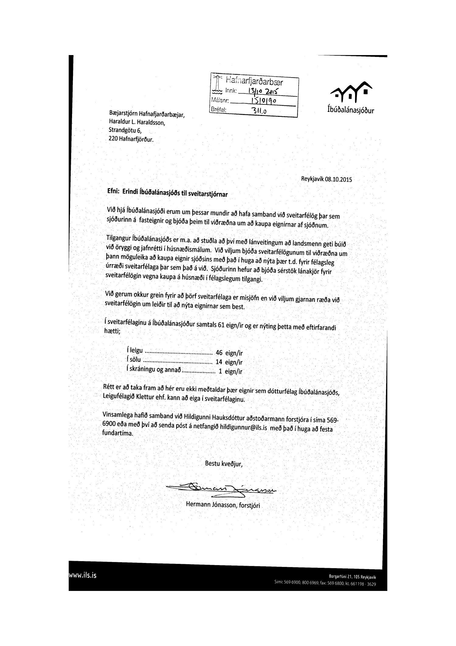 Bréf Íbúðalánasjóðs það sem Hafnarfjarðarbæ er boðið að kaupa íbúðir í eigu sjóðsins.