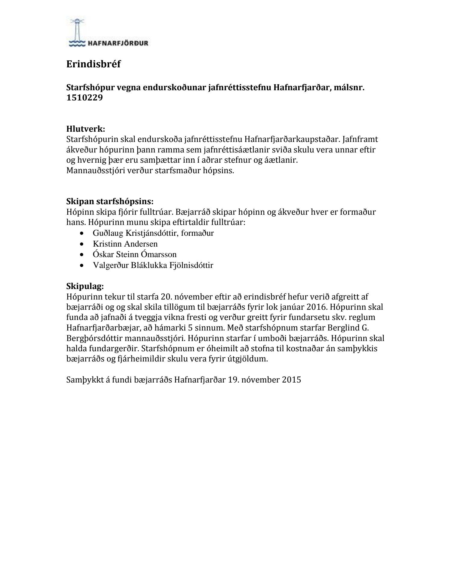 Erindisbréf samþykkt.Fulltrúar bæjarráðs í starfshópnum eru:Guðlaug KristjánsdóttirKristinn AndersenValgerður Bláklukka FjölnisdóttirÓskar Steinn Ómarsson