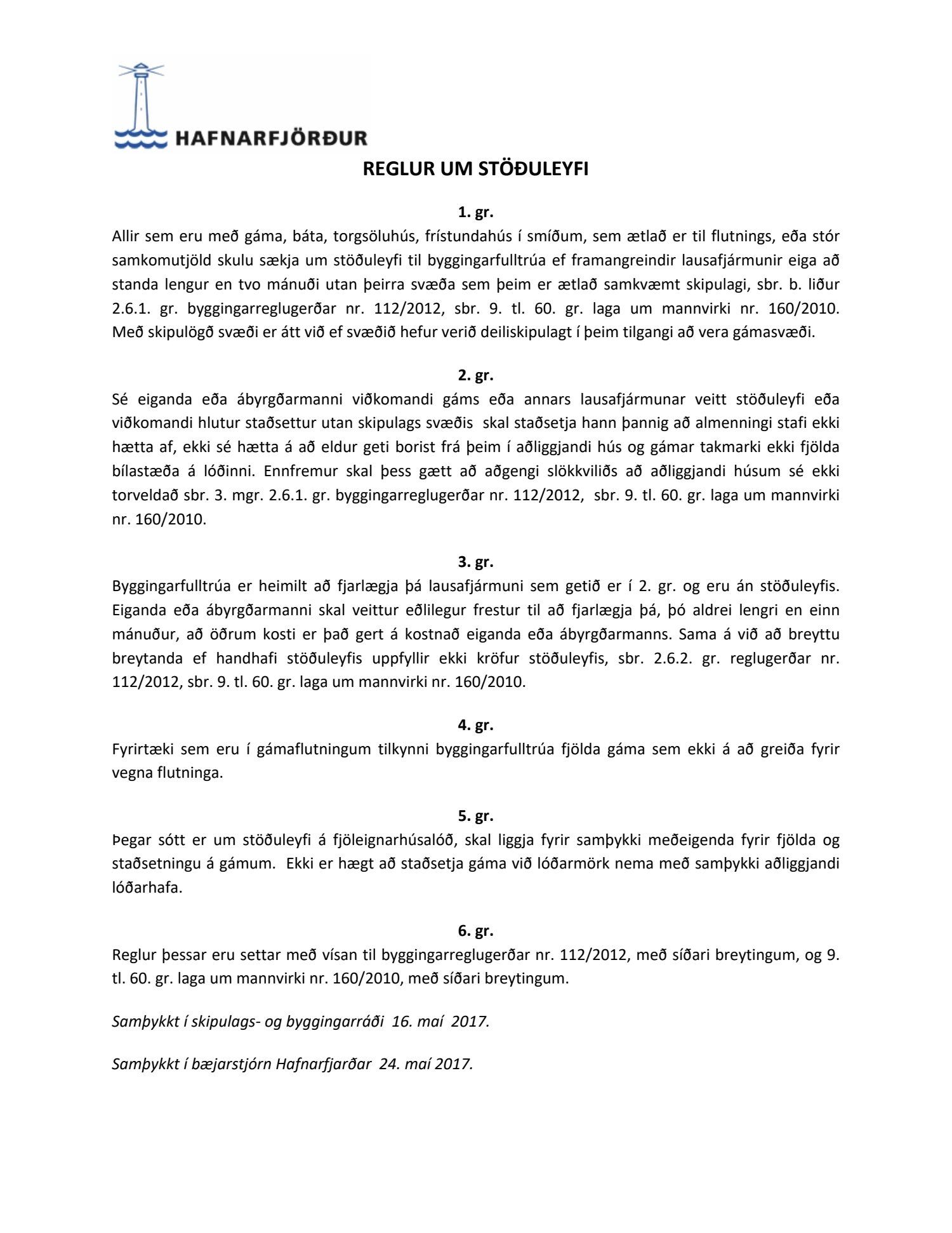 Skipulags- og byggingarráð samþykkir uppfærðar reglur um stöðuleyfi fyrir sitt leyti og leggur til við bæjarstjórn: "Bæjarstjórn Hafnarfjarðar samþykkir uppfærðar reglur um stöðuleyfi dags. 11. mái 2017."