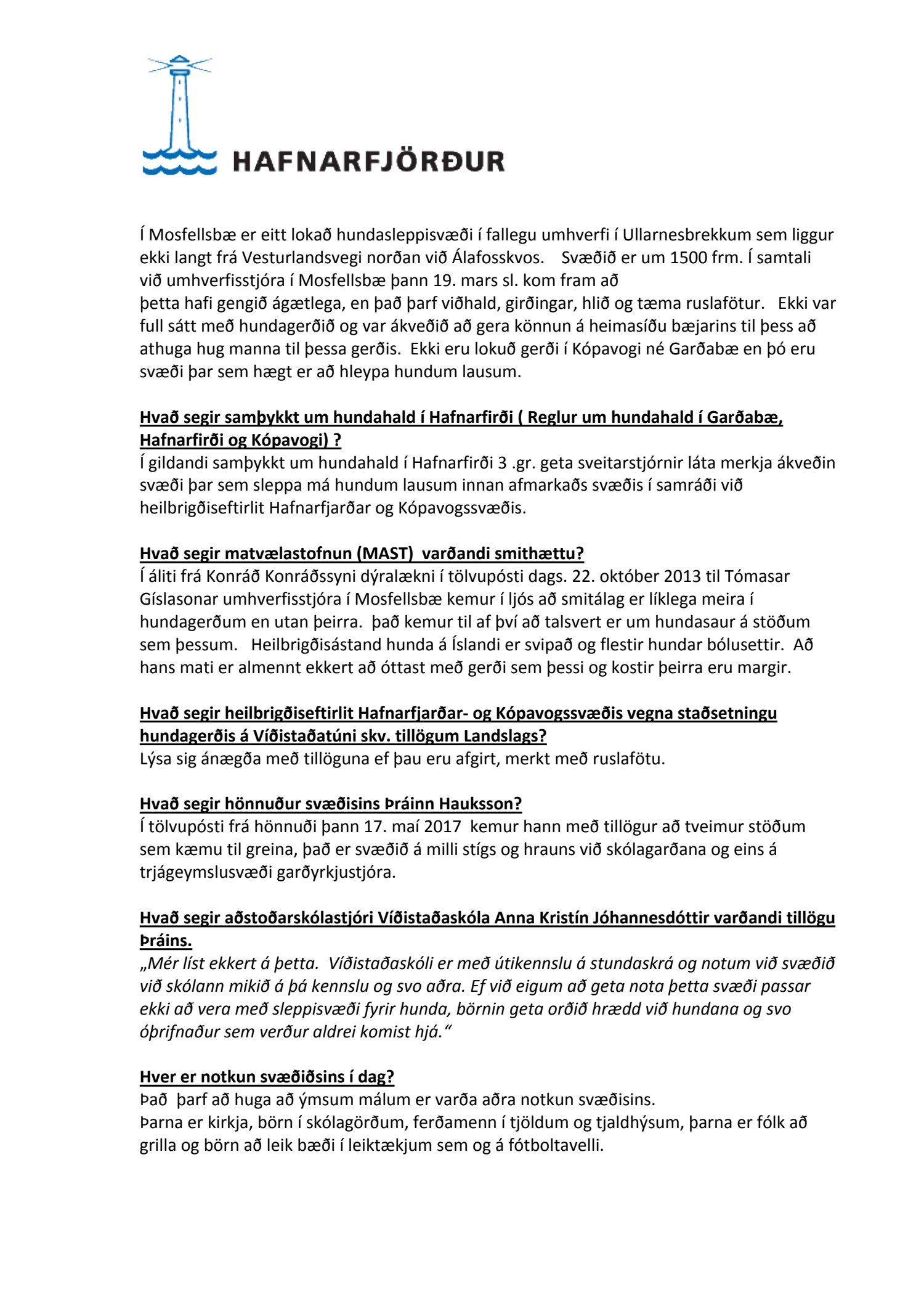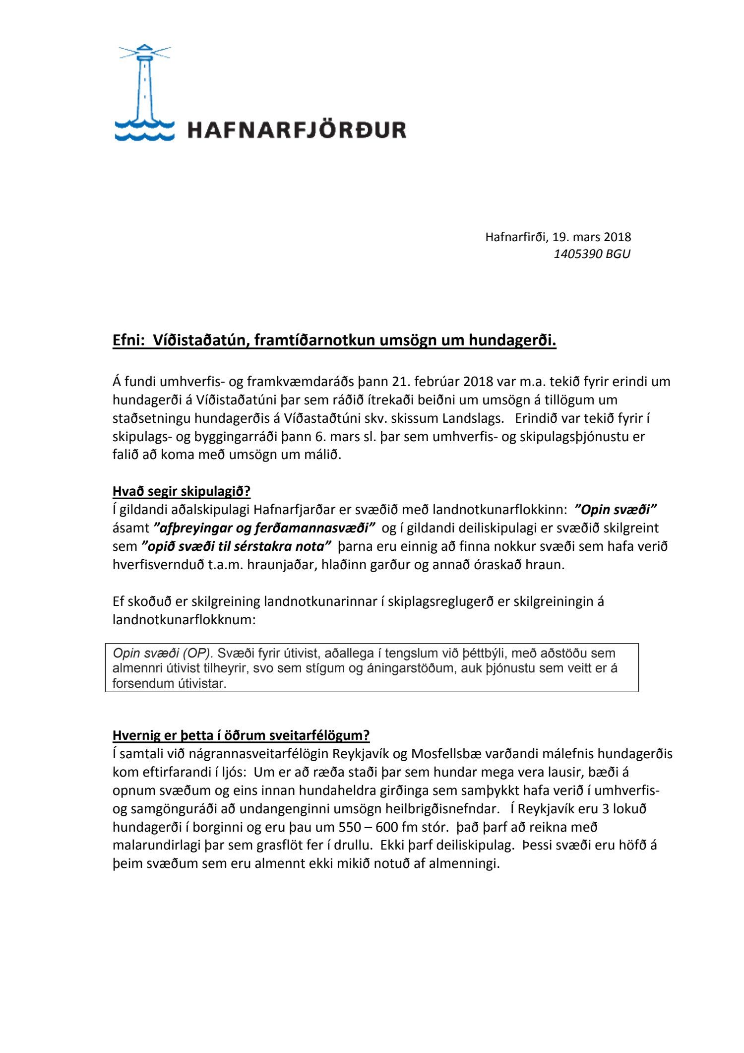 Á fundi skipulags- og byggingarráðs þann 4. apríl sl. var gerð eftirfarandi bókun: Tekin fyrir að nýju bókun umhverfis- og framkvæmdaráðs frá 21.2 s.l. þar sem ítrekuð er beiðni frá 31.5. 2017 um umsögn skipulags- og byggingarráðs á tillögu um staðsetningu hundagerðis á Víðistaðatúni skv. skissu