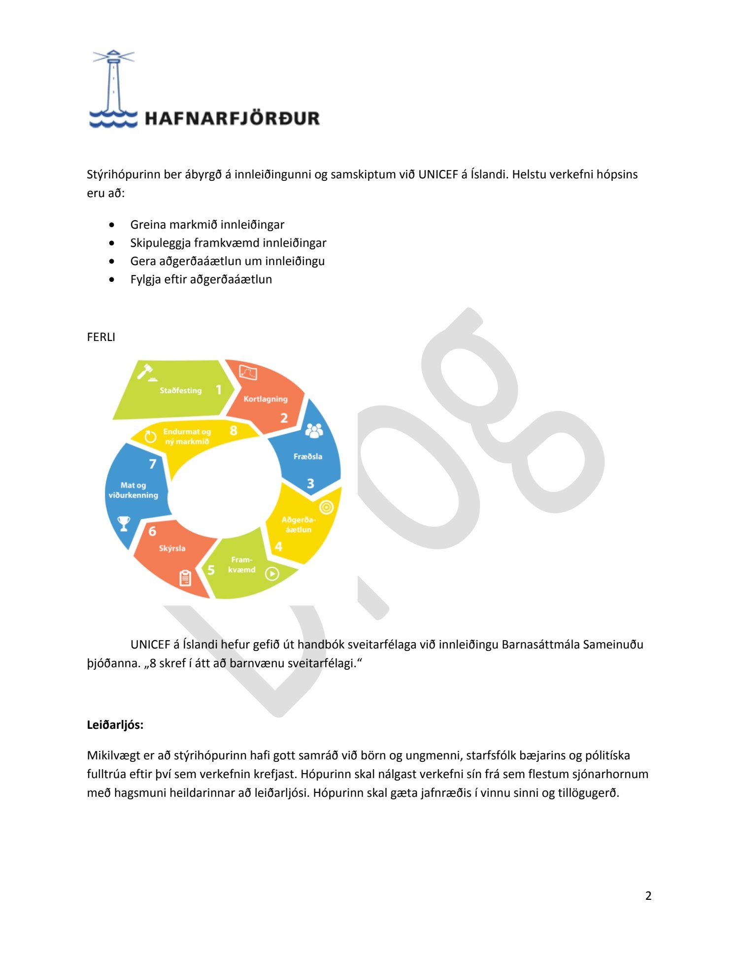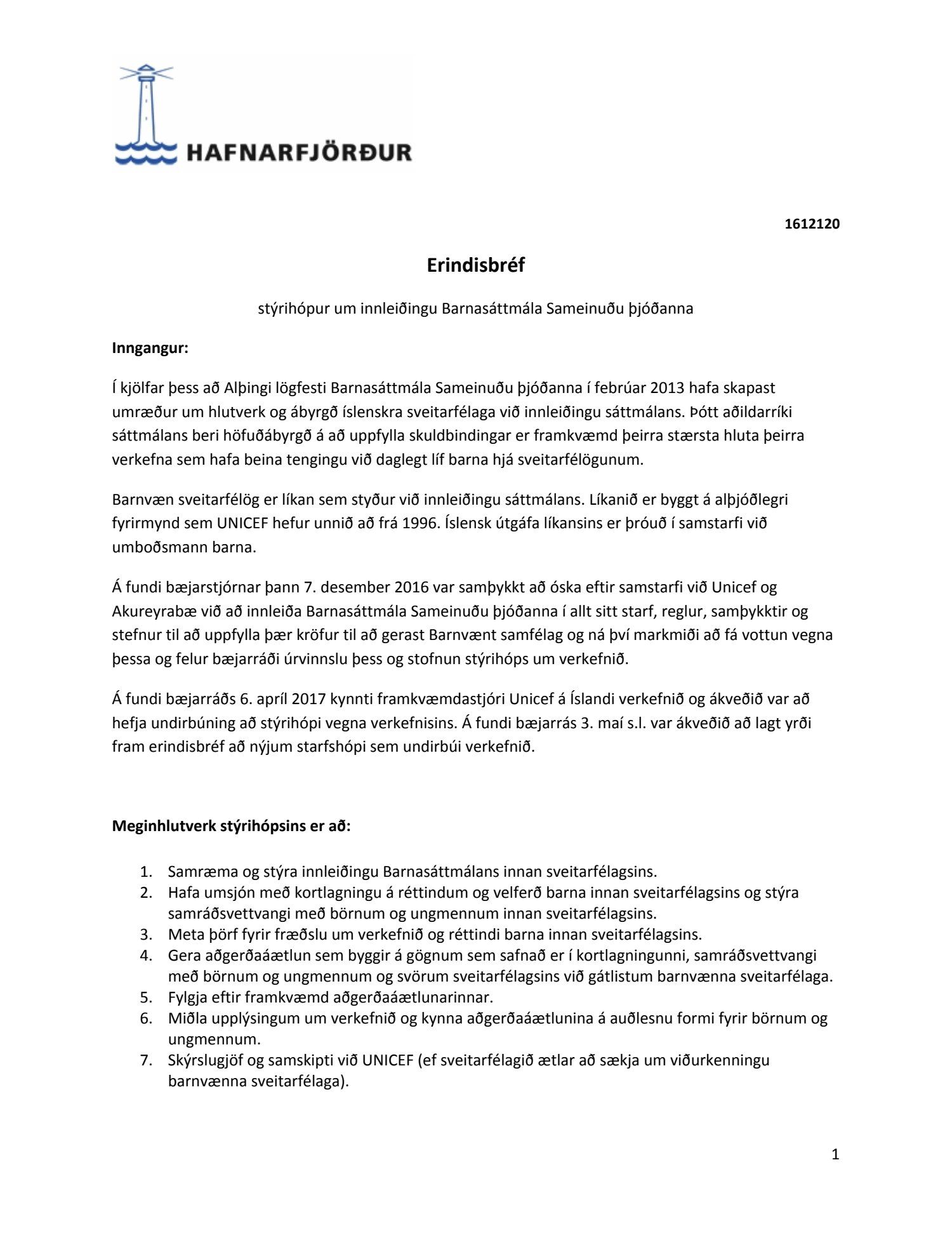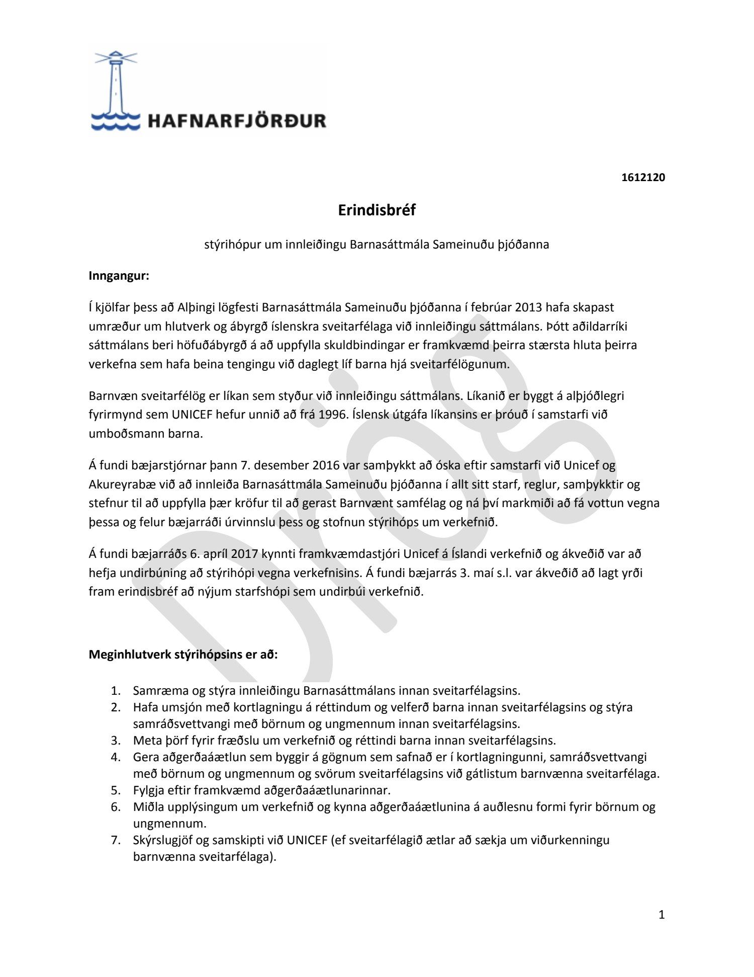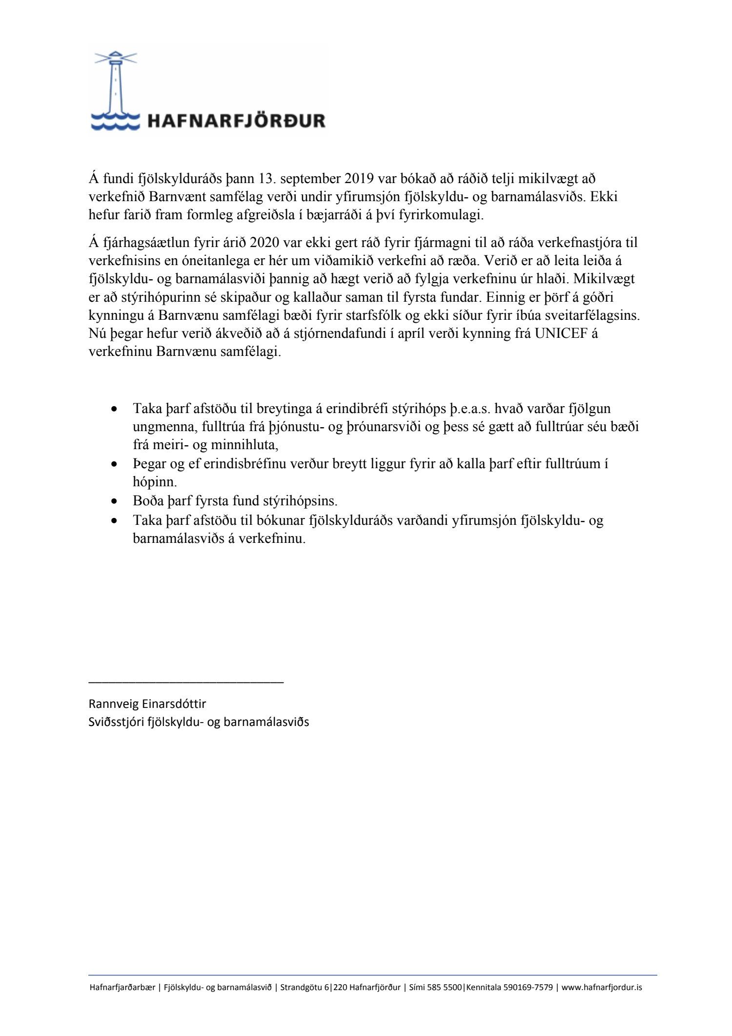 Bæjarráð fagnar því að vinnan sé farin af stað, auk þess að hafin sé vinna á fjölskyldu- og barnamálasviði er varðar stuðning við börn á flótta. UNICEF hefur haft aðkomu að verkefninu auk starfsfólks frá mennta- og lýðheilsusviði. Verkefnið felst í því að auka lífsgæði ungmennanna og vinna með þeim að ýmsum verkefnum og athöfnum sem nýtast þeim í lífi og starfi. Ánægjulegt að segja frá því að félagsmálaráðuneytið veitti styrk nú nýverið, kr. 4 milljónir í verkefnið. Að þessu sögðu leggur bæjarráð til brugðist verði ábendingum UNICEF er varðar aðkomu kjörinna fulltrúa meiri- og minnihluta í stýrihópinn og samþykkir að fulltrúar frá ungmennaráði verði fjórir. Bæjarráð samþykkir fyrirliggjandi erindisbréf og tekur undir bókun fjölskylduráðs um að yfirumsjón verkefnisins verði hjá fjölskyldu- og barnamálasviði í góðu samstarfi við önnur svið eftir því sem við á.