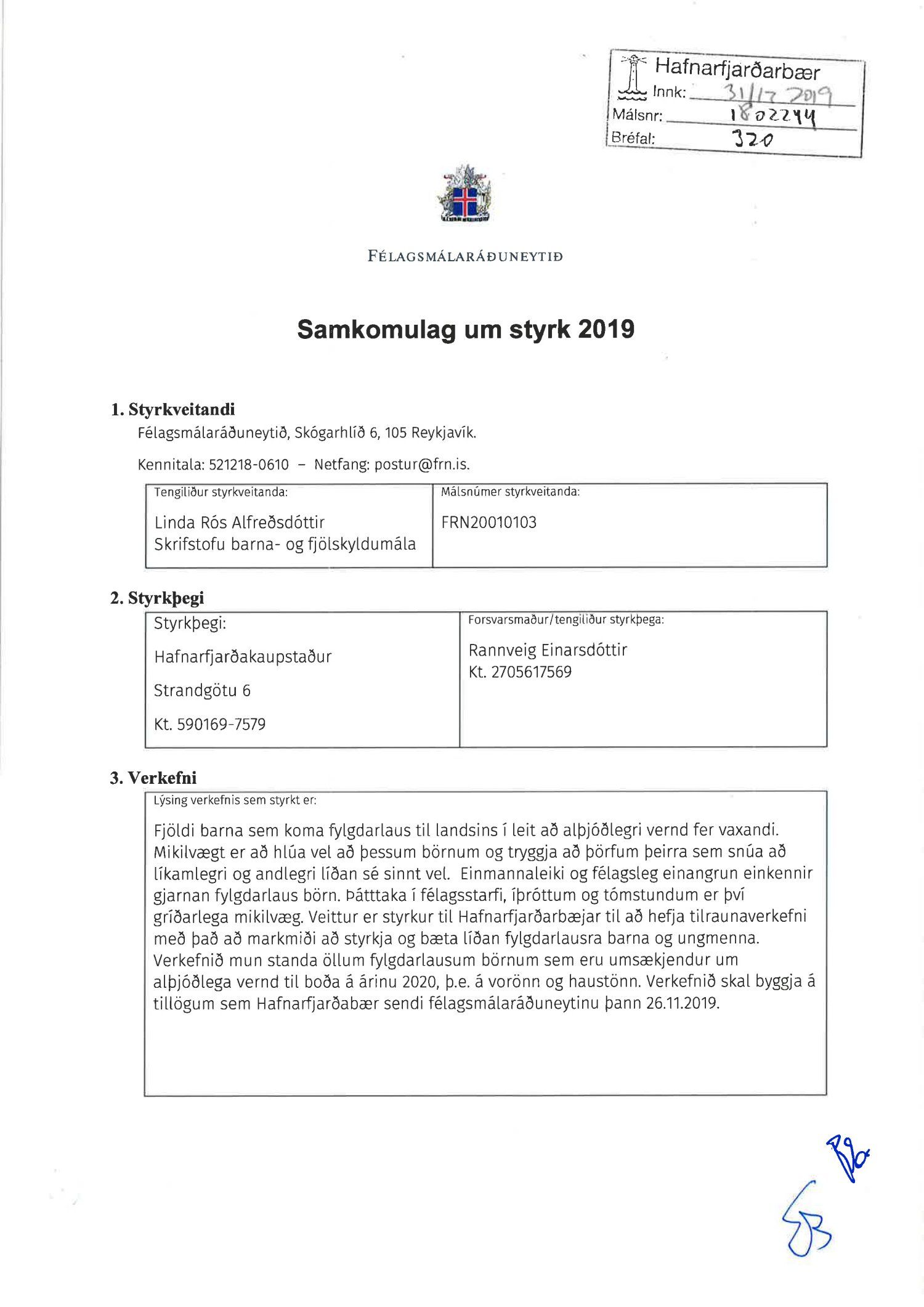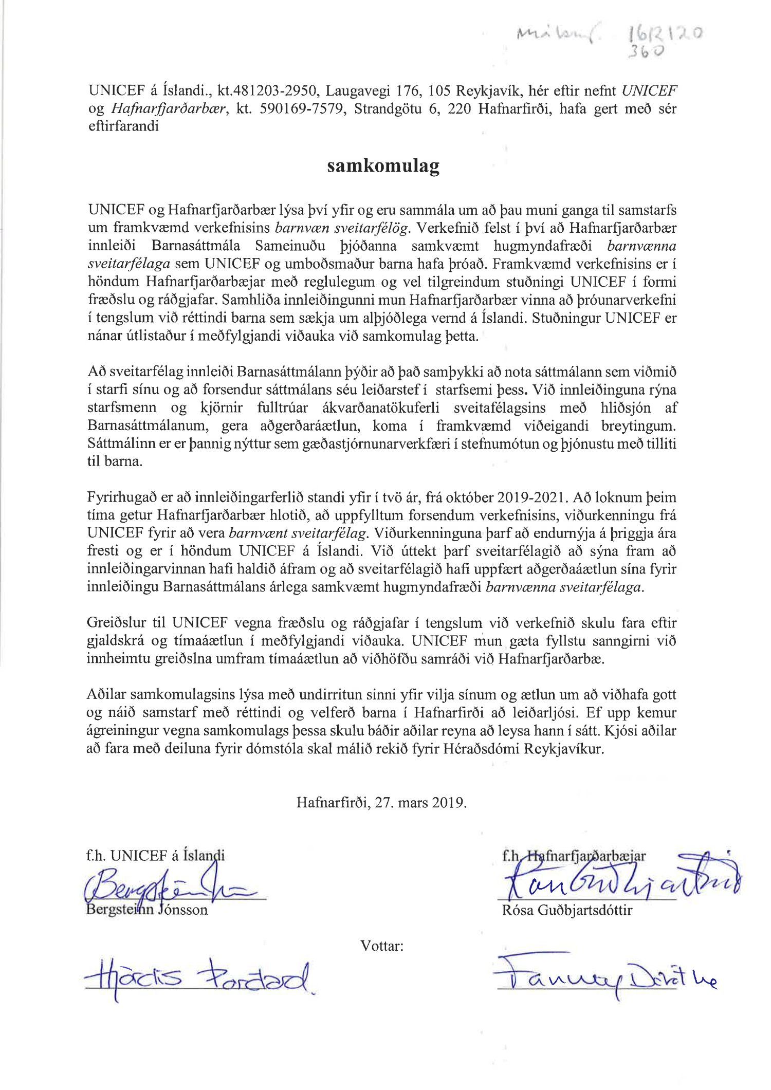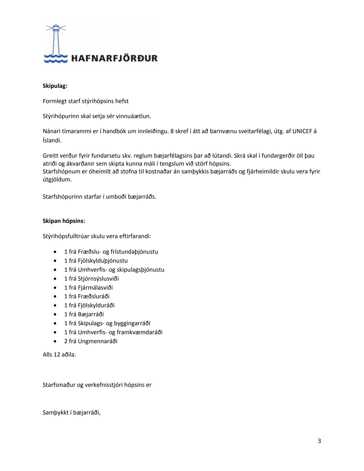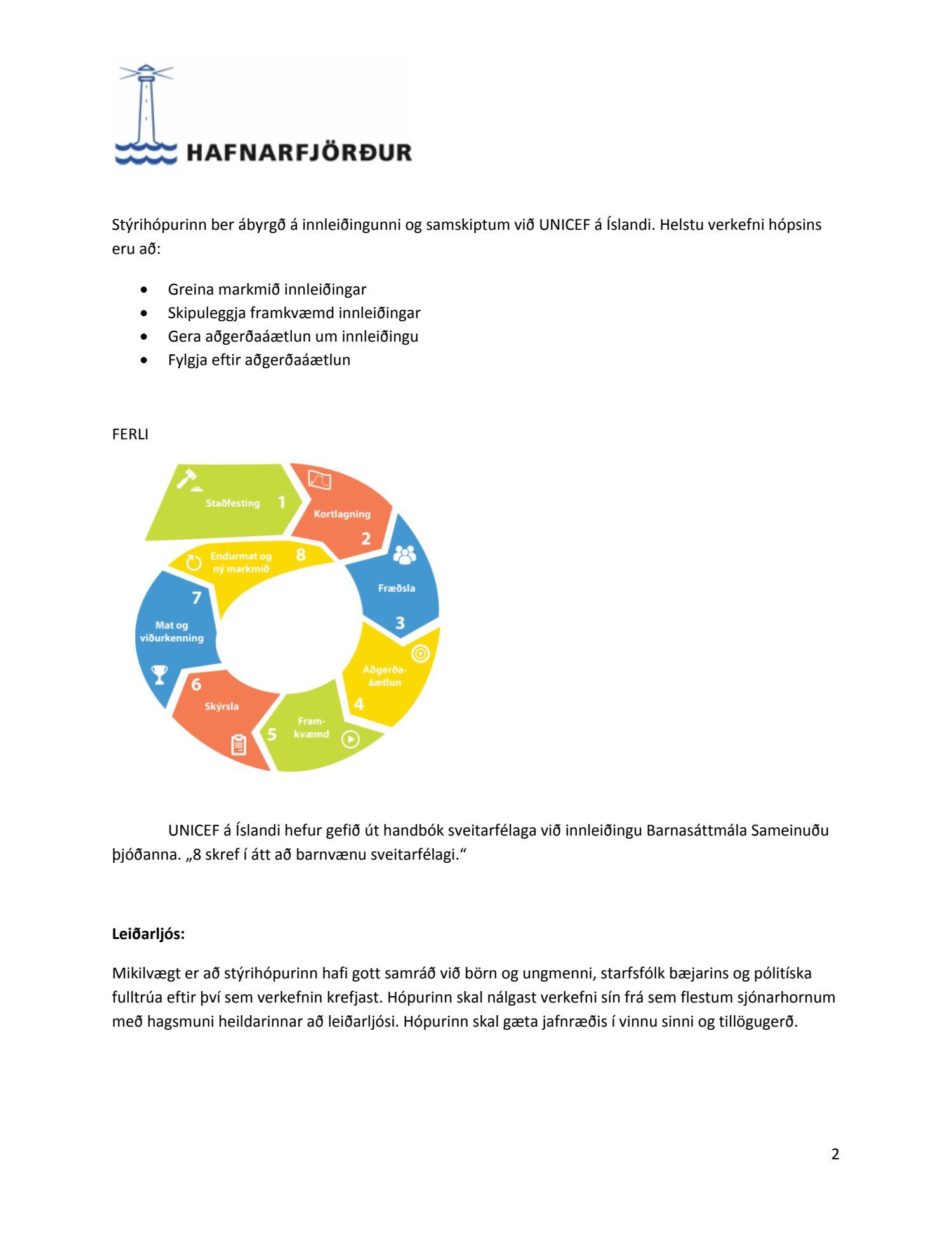 Bæjarráð fagnar því að vinnan sé farin af stað, auk þess að hafin sé vinna á fjölskyldu- og barnamálasviði er varðar stuðning við börn á flótta. UNICEF hefur haft aðkomu að verkefninu auk starfsfólks frá mennta- og lýðheilsusviði. Verkefnið felst í því að auka lífsgæði ungmennanna og vinna með þeim að ýmsum verkefnum og athöfnum sem nýtast þeim í lífi og starfi. Ánægjulegt að segja frá því að félagsmálaráðuneytið veitti styrk nú nýverið, kr. 4 milljónir í verkefnið. Að þessu sögðu leggur bæjarráð til brugðist verði ábendingum UNICEF er varðar aðkomu kjörinna fulltrúa meiri- og minnihluta í stýrihópinn og samþykkir að fulltrúar frá ungmennaráði verði fjórir. Bæjarráð samþykkir fyrirliggjandi erindisbréf og tekur undir bókun fjölskylduráðs um að yfirumsjón verkefnisins verði hjá fjölskyldu- og barnamálasviði í góðu samstarfi við önnur svið eftir því sem við á.