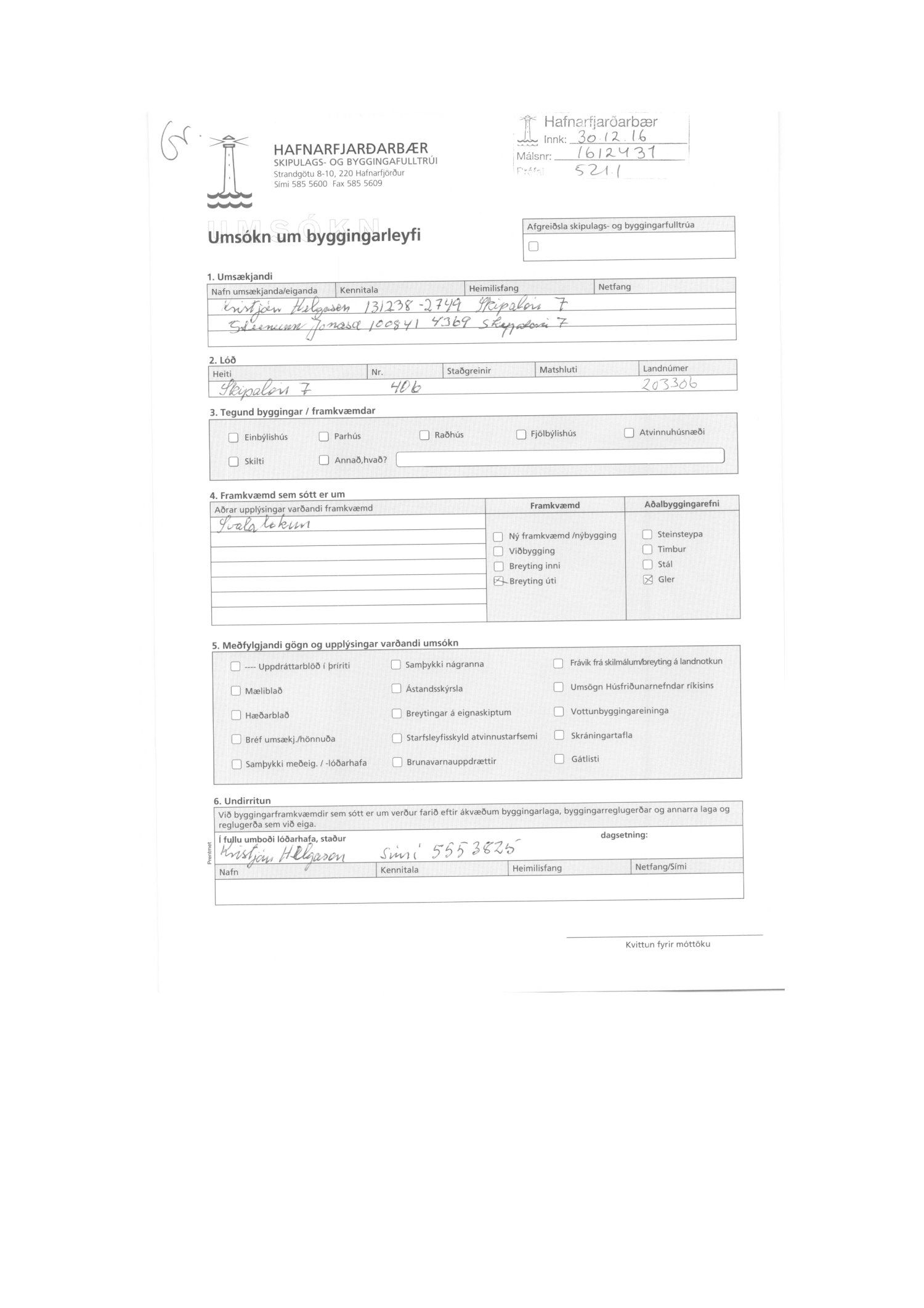 Kristján Helgasson og Steinunn Jónsdóttir sækja 30.12.16 um svalalokun á íbúð 406