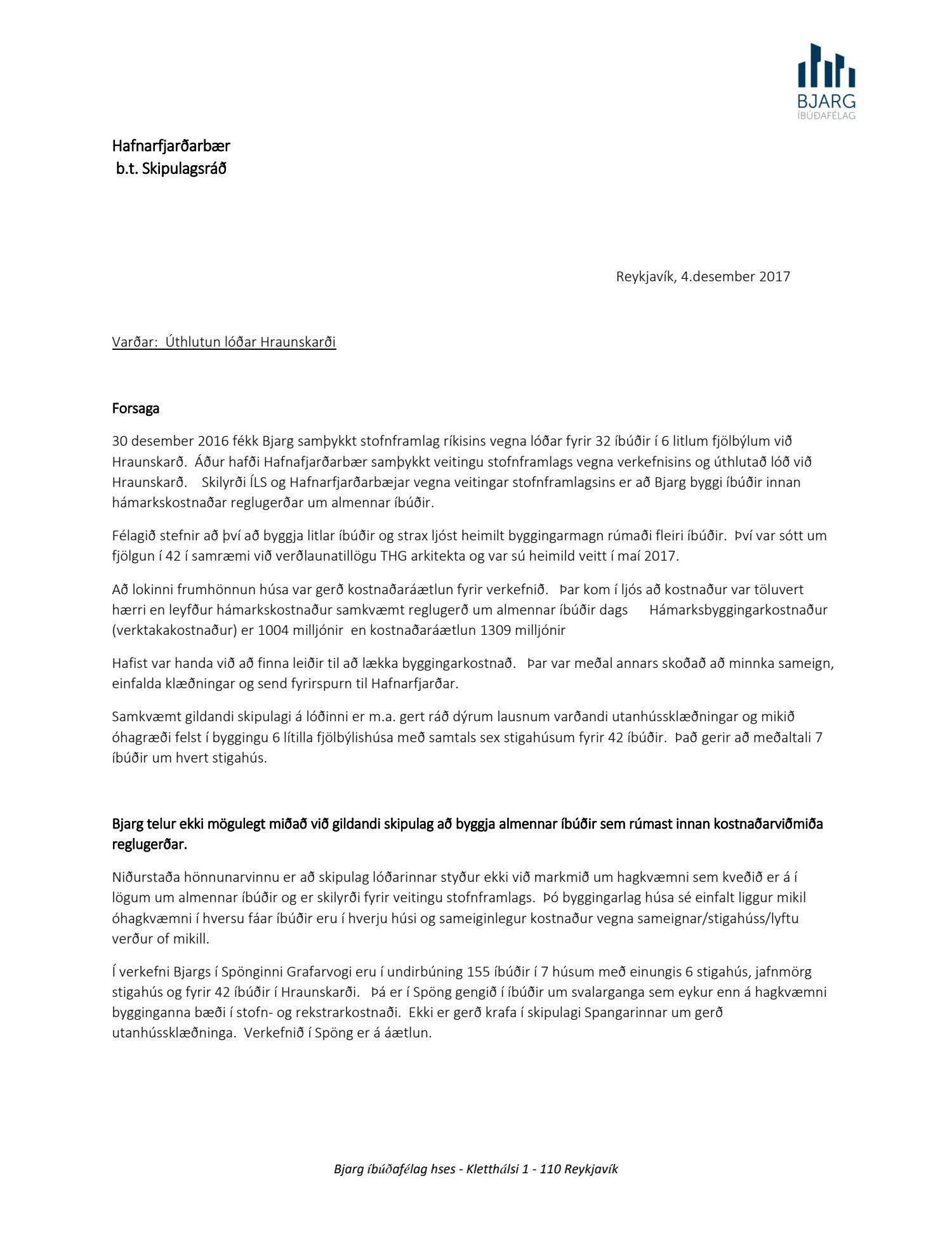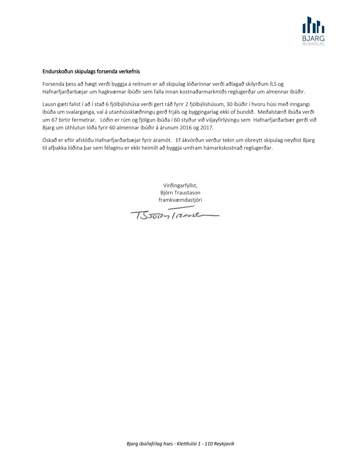 Fulltrúi Samfylkingarinnar fagnar því að Bjarg íbúðarfélag sæki um lóð undir íbúðir í Hafnarfirði eftir að hafa skilað lóð í Skarðshlíð fyrr á árinu vegna íþyngjandi skilmála sem féllu ekki innan kostnaðarmarkmiðs reglugerðar um almennar íbúðir. Í Hafnarfirði eru langir biðlistar eftir félagslegu húsnæði og skortur á hagkvæmu húsnæði á viðráðanlegum kjörum fyrir almenning. Það er því mikilvægt að vinna að því að úthluta Bjargi íbúðarfélagi lóð svo framkvæmdir geti hafist sem fyrst.