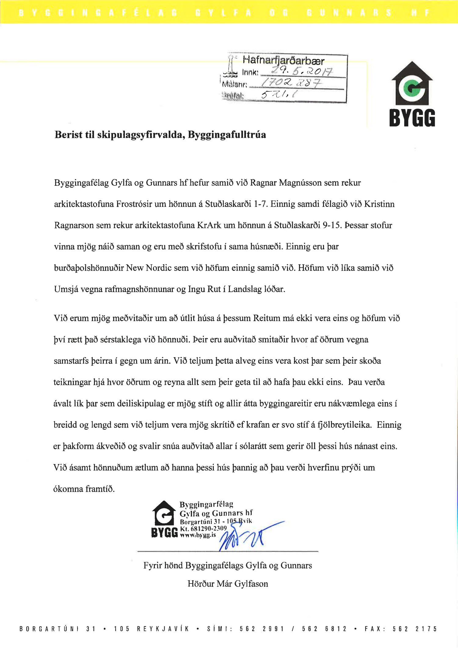 Tekin fyrir að nýju fyrirspurn Byggingarfélags Gylfa og Gunnars, dags. 21.2.2017, þar sem óskað er eftir að byggja fjölbýlishús samkvæmt teikningum Ragnars Magnússonar byggingarfr. dags. 13.2.2017. Nýjar teikningar bárust 11.04.2017.