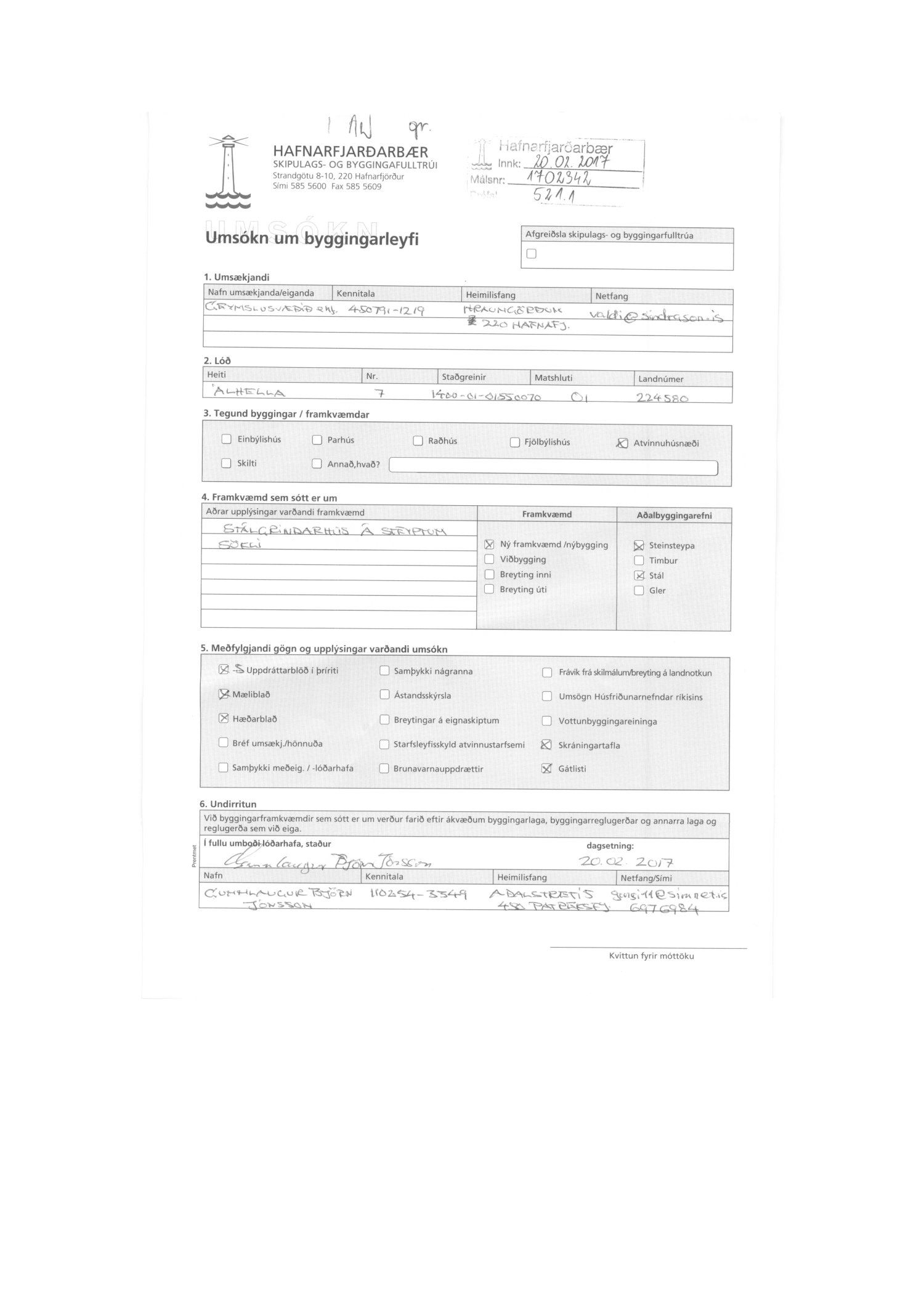 Geymslusvæðið sækir 20.02.2017 um byggingarleyfi fyrir stálgrindarhús á steyptum sökli samkvæmt teikningum Gunnlaugs Björns Jónssonar dags. 20.02.2017.