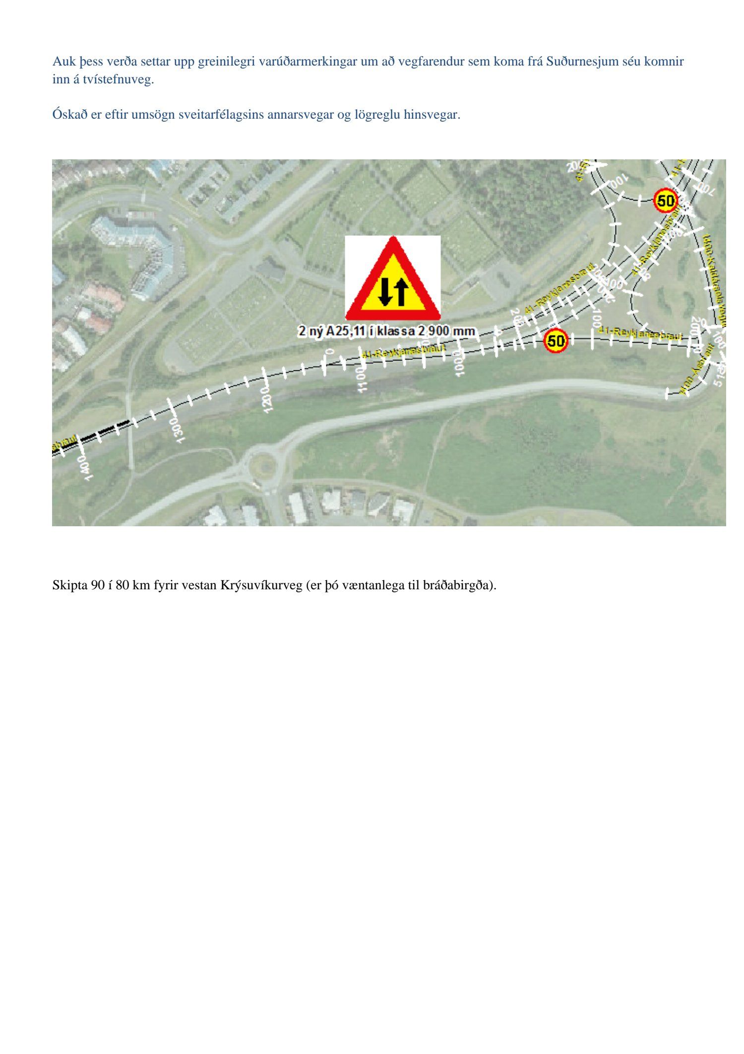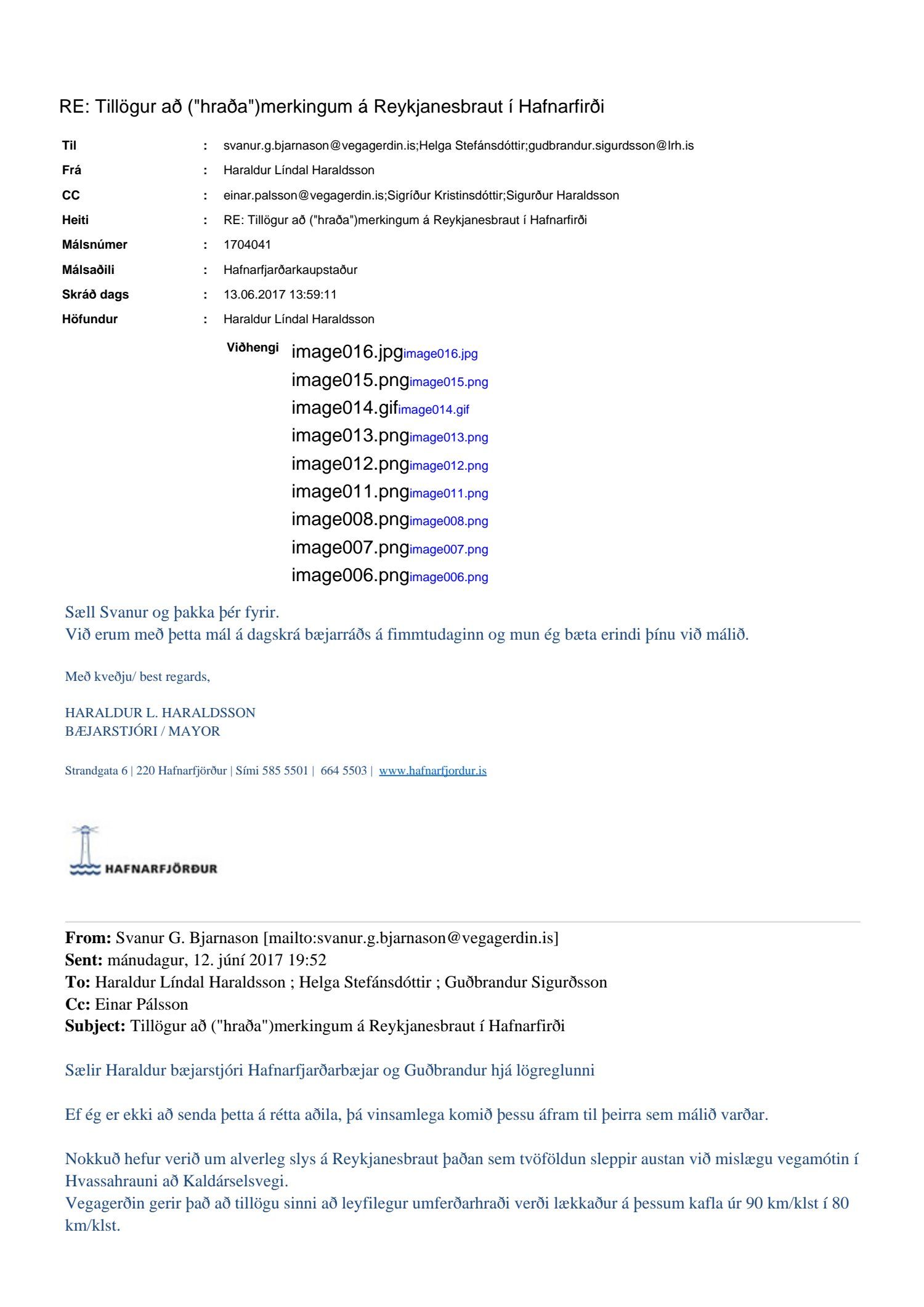 Vegagerðin tilefnir Jónas Snæbjörnsson, framkvæmdastjóra þróunarsviðs og Svan G. Bjarnason, svæðisstjóra í starfshópinn.Bæjarstjóra falið að vinna áfram að málinu í samræmi við umræður á fundinum.