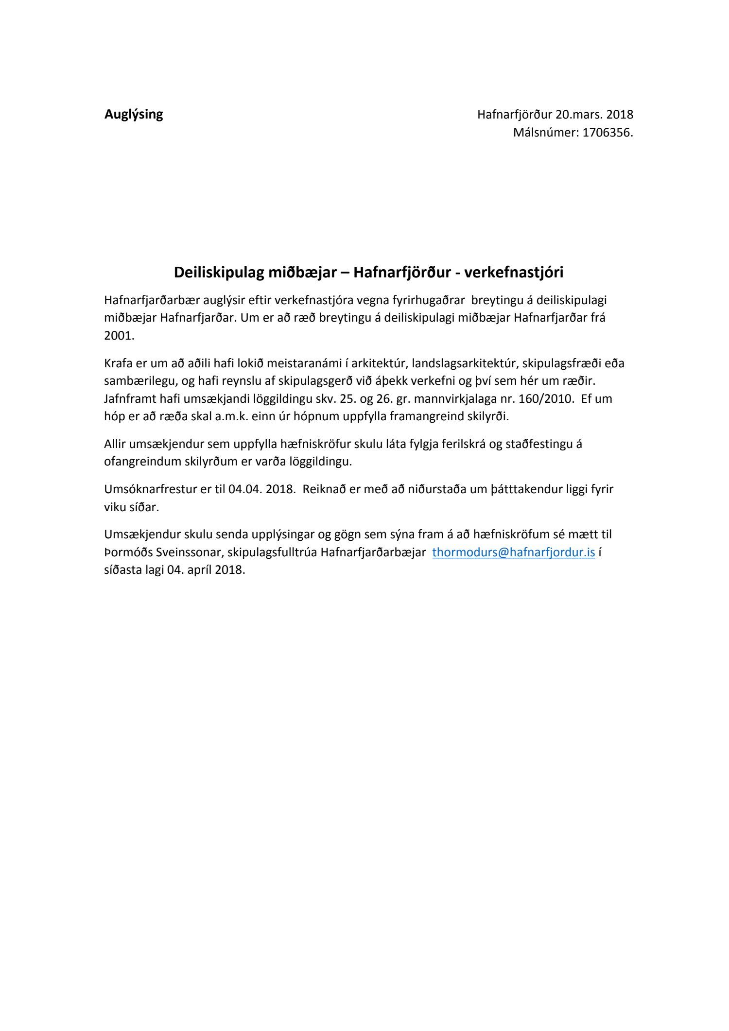Tekin fyrir á ný tillaga um að Hafnarfjarðarbær auglýsi eftir skipulagshönnuðum vegna fyrirhugaðrar deiliskipulagsvinnu innan bæjarmarkanna. Um ólík landsvæði er að ræða. Horft er til þess að þétta byggð innan bæjarins í þegar byggðum hverfum þar sem landrými er fyrir hendi. Meginmarkmið er að stuðla að betri nýtingu landsvæðis undir íbúðabyggð um leið og byggðamynstur hvers hverfis fyrir sig er haft að leiðarljósi. Enn fremur er um að ræða deiliskipulagsgerð á nýbyggingar- og iðnaðarsvæðum. Erindið var lagt fram á fundi ráðsins þann 16.05. s.l.