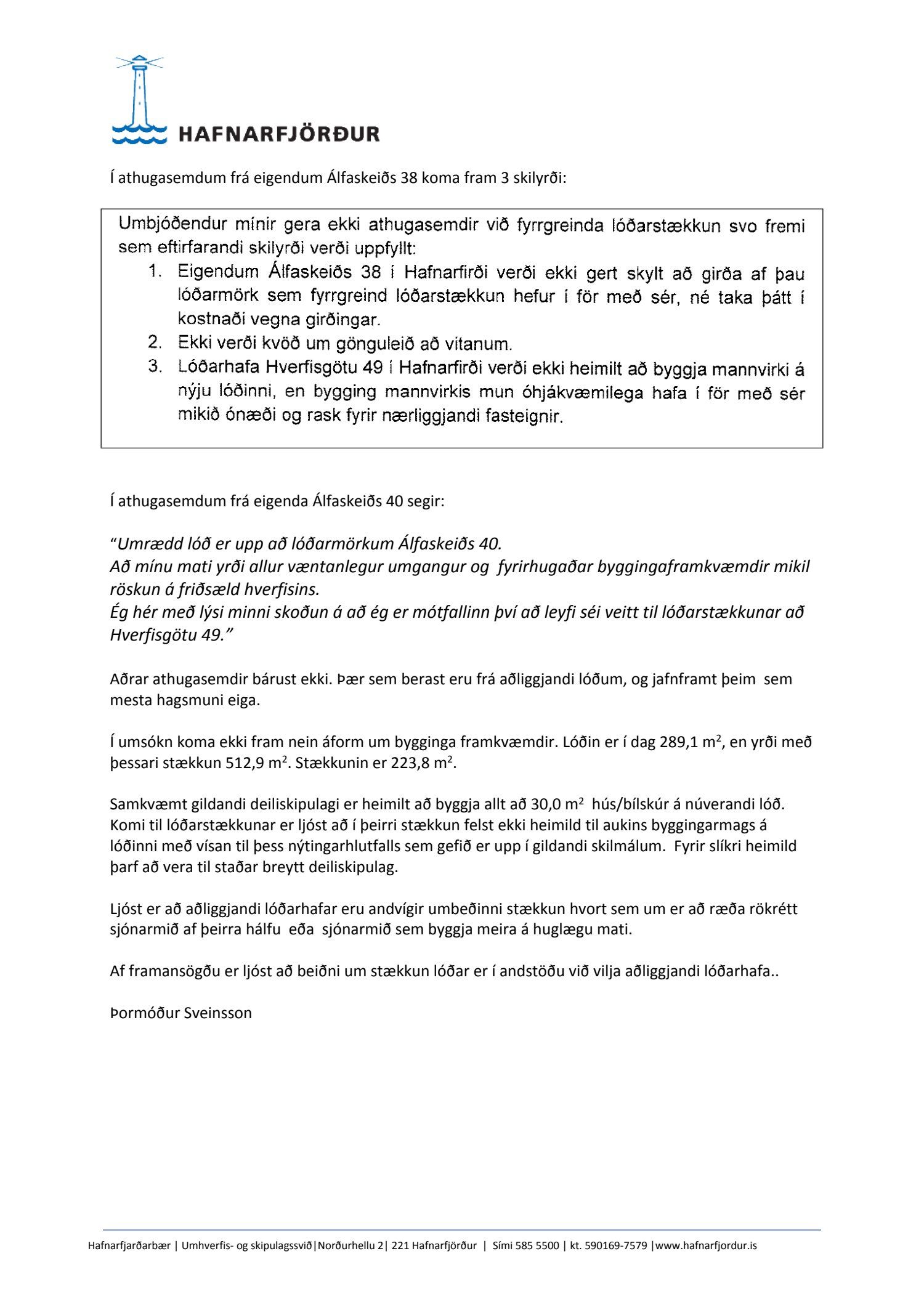 Athugasemdir sem bárust fjölluðu um hugsanlega byggingu á lóðinni og aðgengi að vitanum. Skipulags- og byggingarráð leggur áherslu á að lóðarstækkunin fjallar ekki um nýtingu lóðar heldur um umrædda lóðarstækkun. Skipulags- og byggingarráð leggur til að aðgengi að vita verði endurskoðað og vísar þvi til vinnslu á umhverfis- og skipulagssviði enda ekki raunhæft að ætla að það verði á þeim stað sem skipulagið gerir ráð fyrir. Skipulags- og byggingarráð samþykkir fyrir sitt leyti umbeðna lóðarstækkun og vísar erindinu aftur til bæjarráðs.