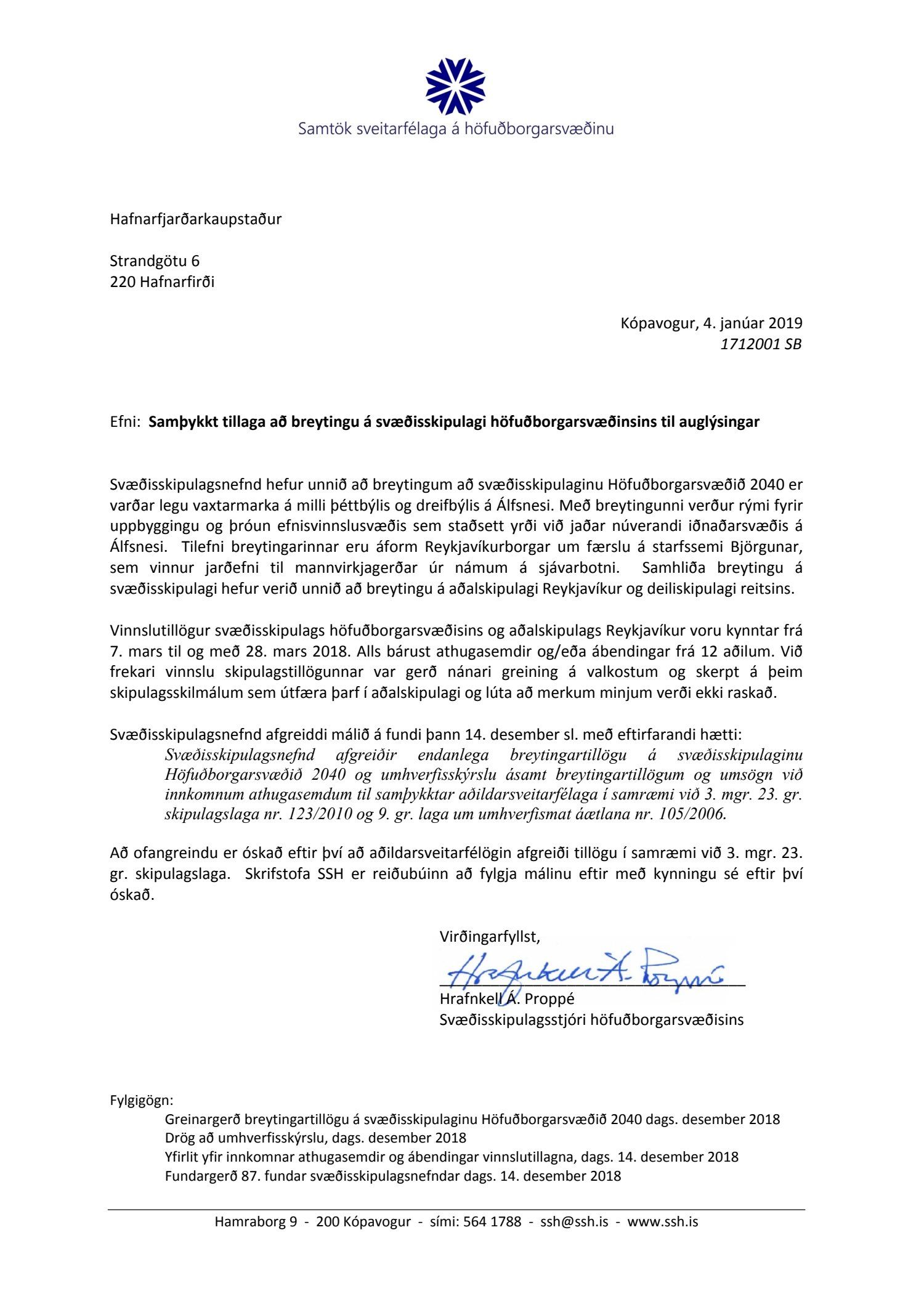 Skipulags- og byggingarráð Hafnarfjarðar samþykkir framlagða breytingu á svæðisskipulagi Höfuðborgarsvæðisins 2040 í samræmi við 3.mgr. 23.gr. skipulagslaga nr. 123/2010. Jafnframt leggur skipulag- og byggingarráð til við bæjarstjórn Hafnarfjarðar að hún samþykki framangreint með vísan til 23.gr. skipulagslaga nr. 123/2010.
