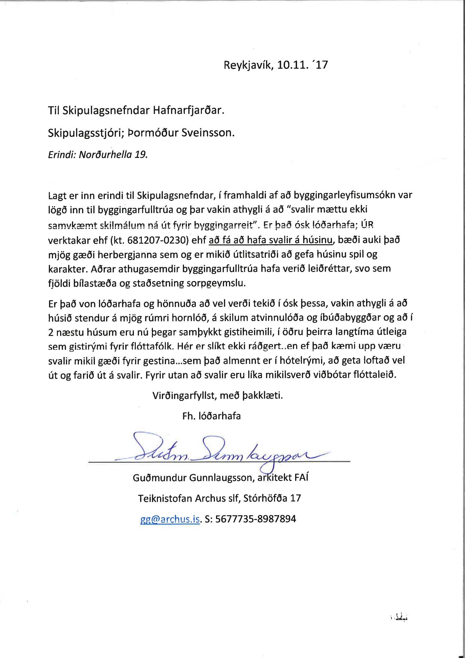 sækja 18.10.2017 um að fá að byggja gitiheimili á 2 hæðum skv. teikningum Guðmundar Gunnlaugssonar dags. 18.8.2017. Óskað er eftir að veitt verði leyfi til að hafa svalir á húsinu sem stangast á við gildandi deiliskipulagsskilmála en þar segir að húsin skulu öll vera innan byggingarreitar þ.m.t. svalir.