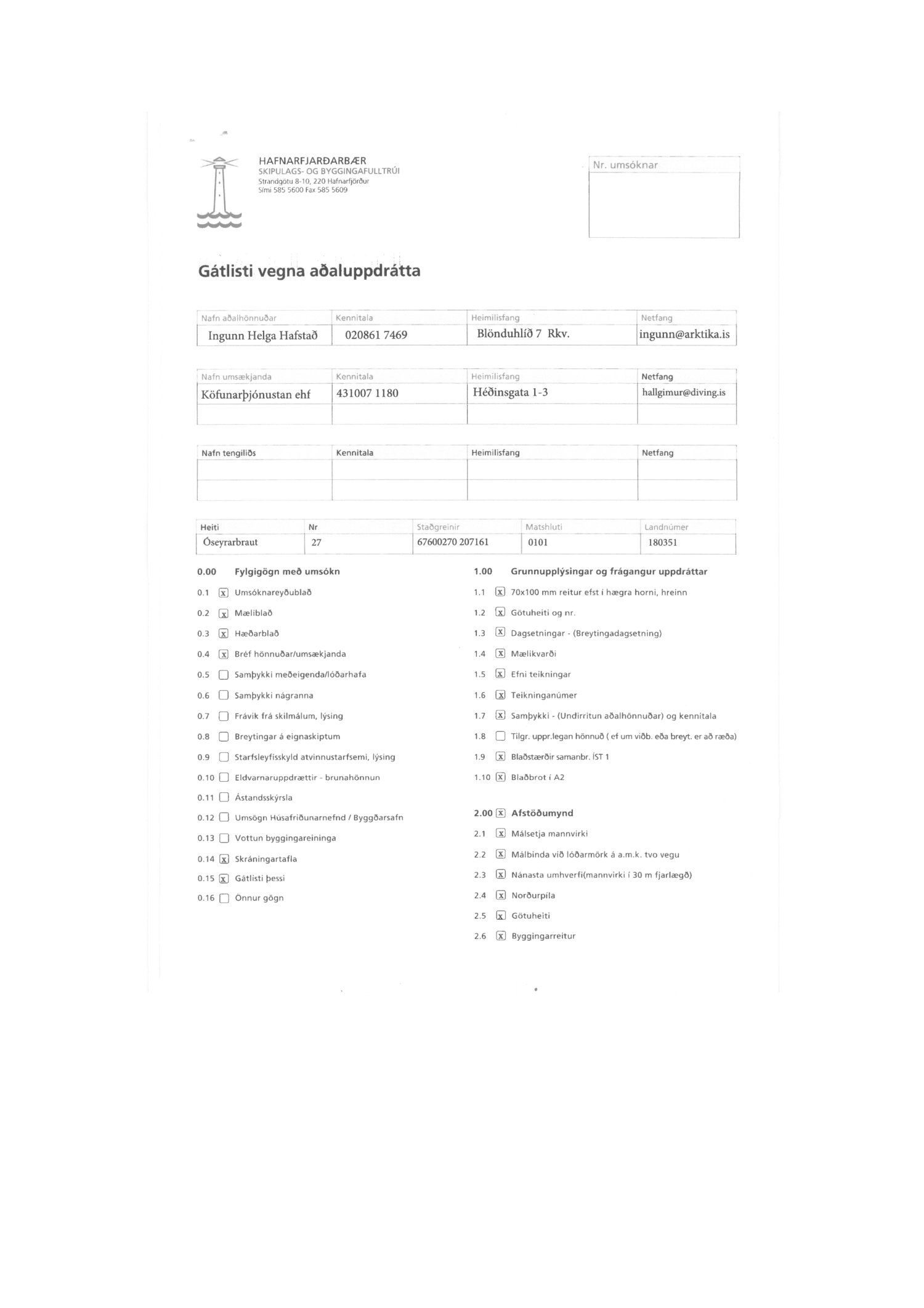 Köfunarþjónustan ehf sækir um að byggja stálgrindarhús á steyptum sökkli á Óseyrarbraut 27. Byggingin um hýsa starfsemi Köfunarþjónustunar ehf svo sem skrifstofur,verstæði og aðrar þjónustudeildar fyrir tækisins auk starfsmannaaðstöðu.Samkvæmt teikningum Ingunar Helgu Hafstað dags.30.11.2017.