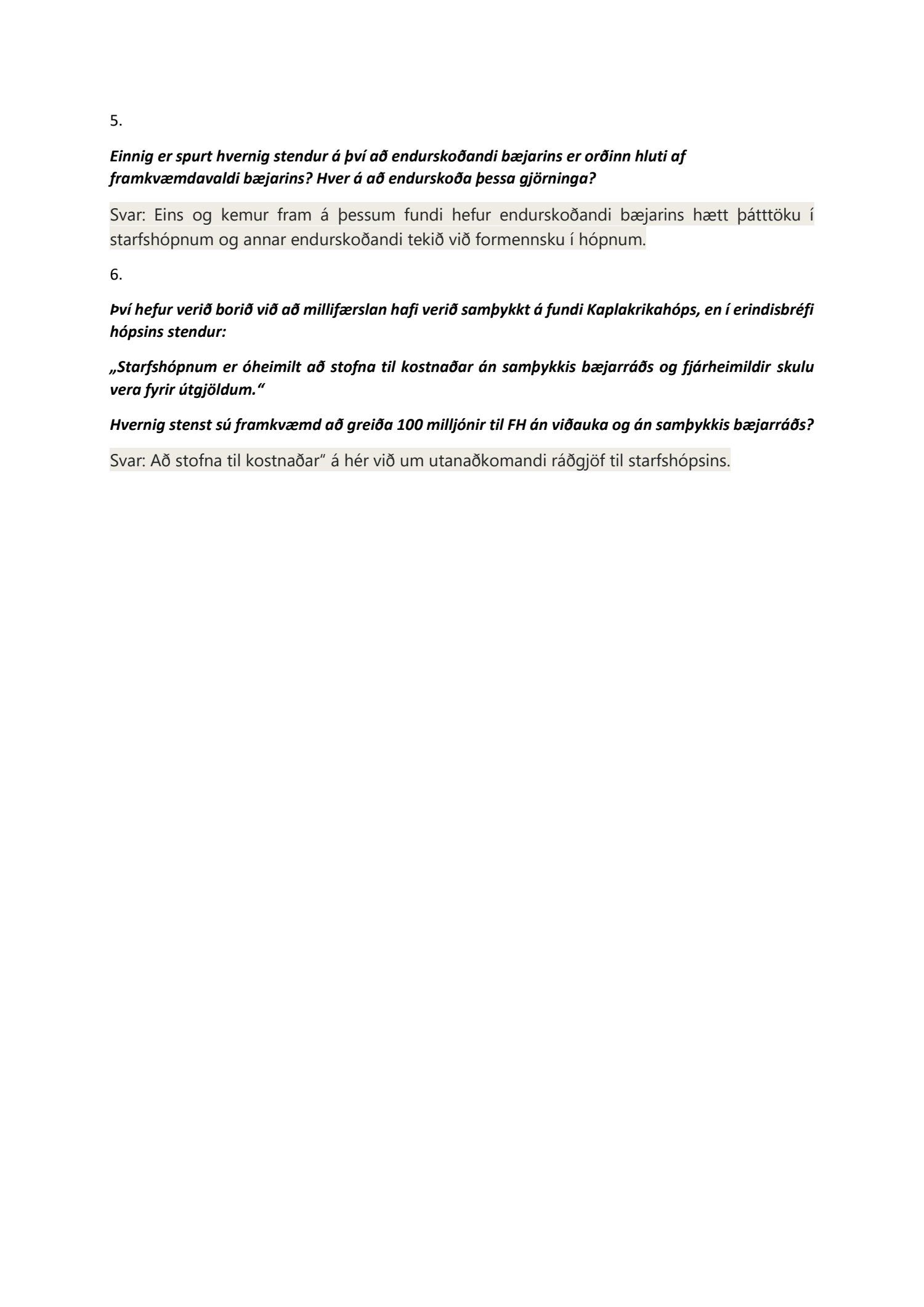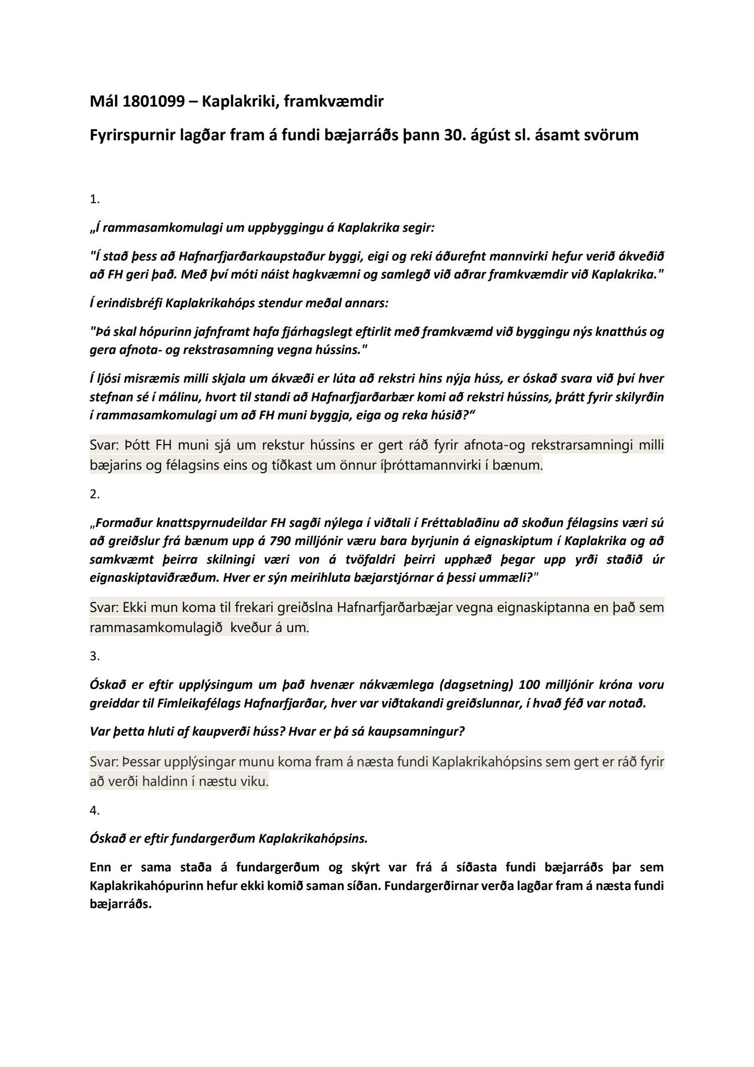 Undirrituð óskar staðfestingar hér í dag á því að ekki liggi fyrir fundargerðir Kaplakrikahóps, með öðrum orðum að ekki sé vitað hvað fram fór á fundum hans í síðasta mánuði. Einnig óska ég að það sé staðfest sem fram kom í umræðum í bæjarráði í dag, að bæjarstjóri og formaður bæjarráðs viti ekki hvernig þeim 100 milljónum sem greiddar voru til FH þann 16. ágúst var varið og geti ekki fengið þær upplýsingar frá viðskiptaaðilanum, nema gegnum fundarsetu í Kaplakrikahópi. Vakin er athygli á því að enginn aðalbæjarfulltrúi á sæti í umræddum starfshópi, sem bendir þá til þess að kjörnir fulltrúar geti ekki fengið upplýsingar um málið með beinum hætti.