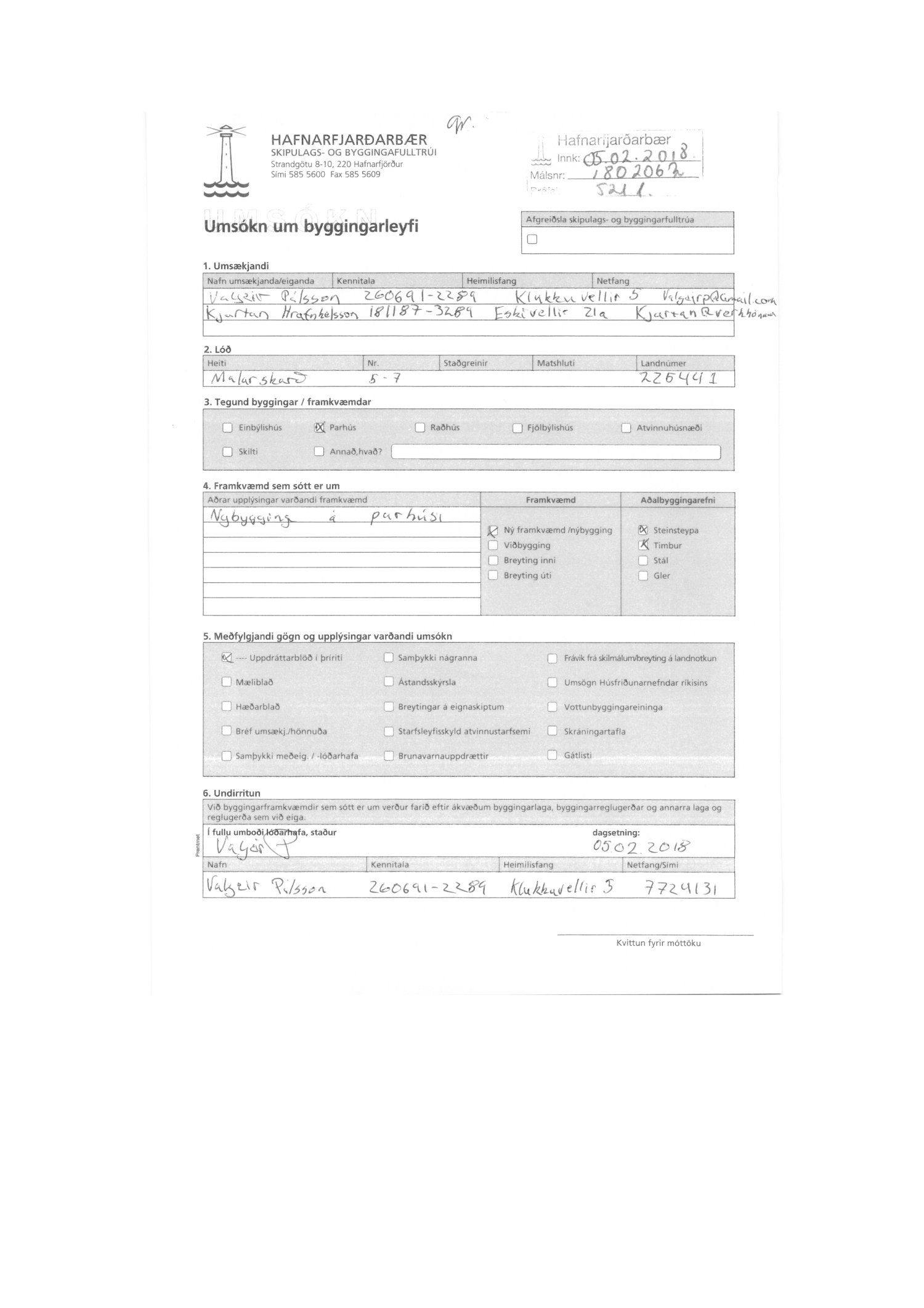 Tekin fyrir að nýju umsókn Valgeirs Pálssonar og Kjartans Hrafnkelssonar dags. 5.2. 2018 um nýbyggingu á parhúsi samkvæmt teikningum Sigurðar Þorvarðarsonar dags.31.01.2018. Nýjar teikningar bárust 13.03.2018