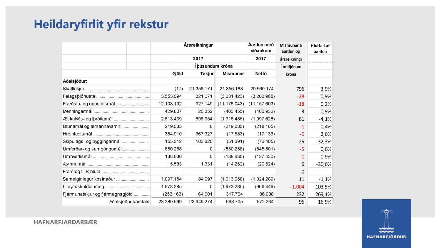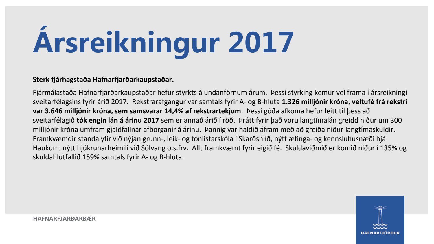 "Meirihlutinn fagnar þeim frábæra árangri sem náðst hefur í að bæta fjárhagsstöðu Hafnarfjarðarbæjar undanfarið og á kjörtímabilinu öllu. Starfsfólki bæjarins er þakkað samstarfið og ómetanlegt framlag við að ná þessum árangri.