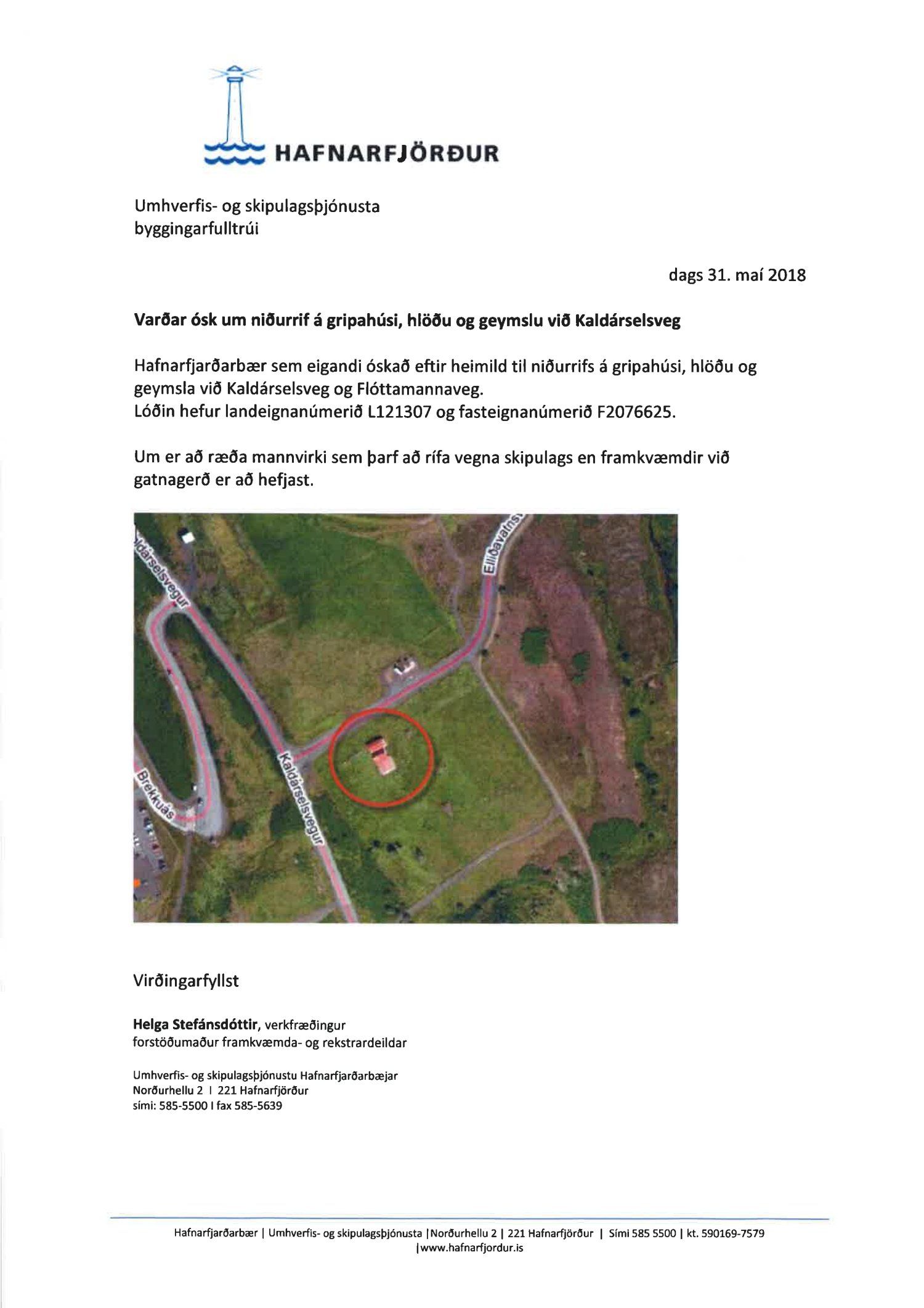 Hafnarfjarðarbær sækir um þann 31.05.2018 um heimild til að rífa niður allar byggingar á lóðinni vegna gatnagerðar við Kaldárselsveg.