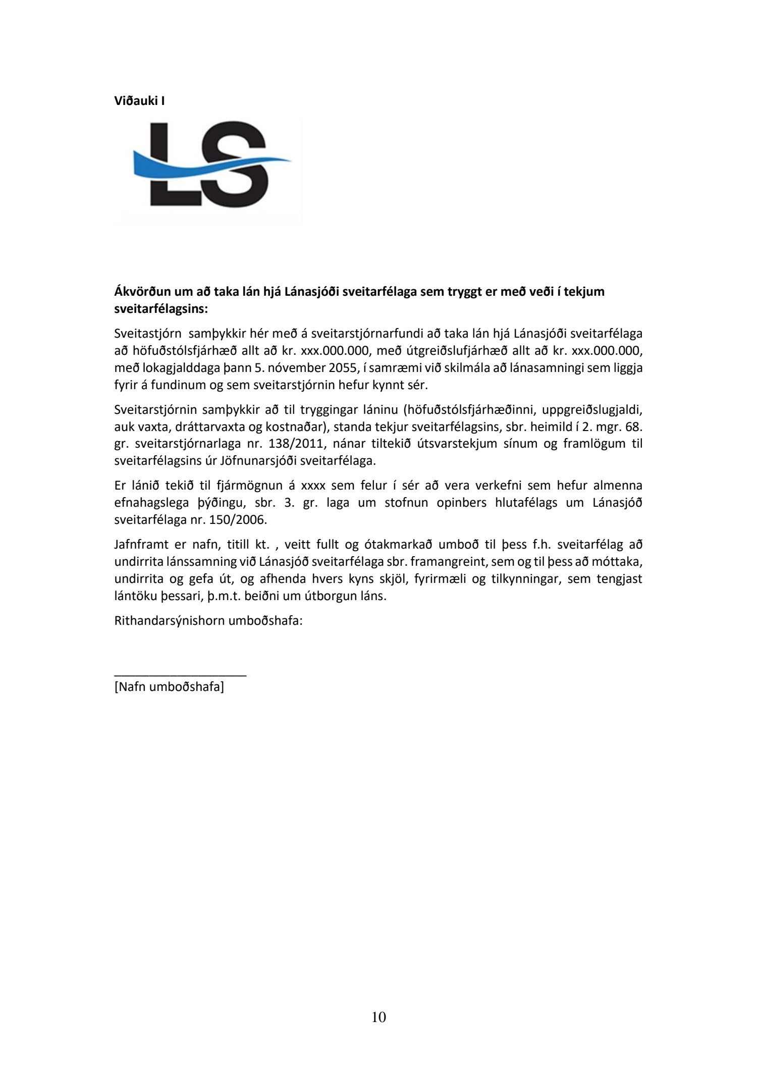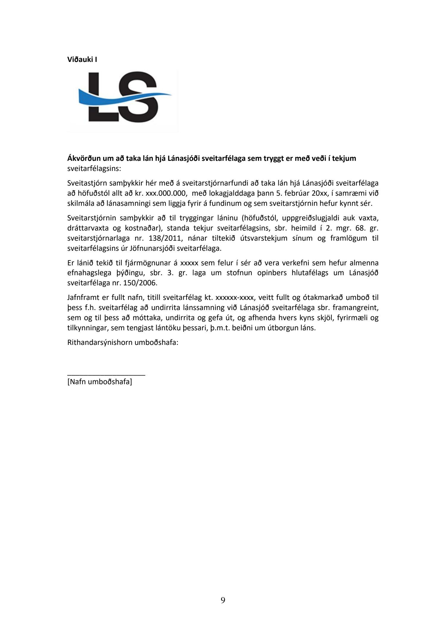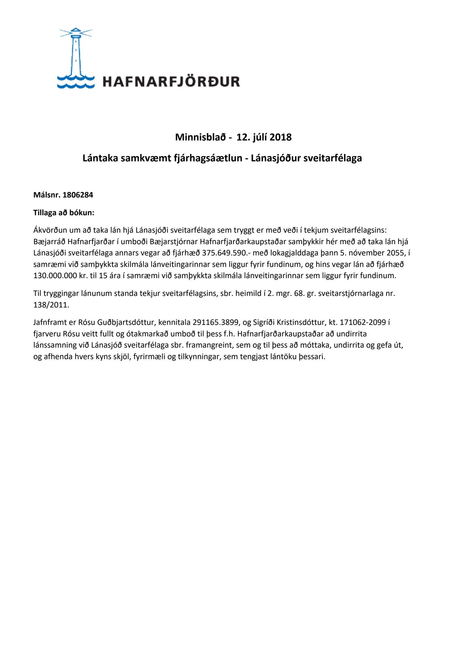 Jafnframt er Rósu Guðbjartsdóttur, kennitala 291165.3899, og Sigríði Kristinsdóttur, kt. 171062-2099 í fjarveru Rósu veitt fullt og ótakmarkað umboð til þess f.h. Hafnarfjarðarkaupstaðar að undirrita lánssamning við Lánasjóð sveitarfélaga sbr. framangreint, sem og til þess að móttaka, undirrita og gefa út, og afhenda hvers kyns skjöl, fyrirmæli og tilkynningar, sem tengjast lántöku þessari.