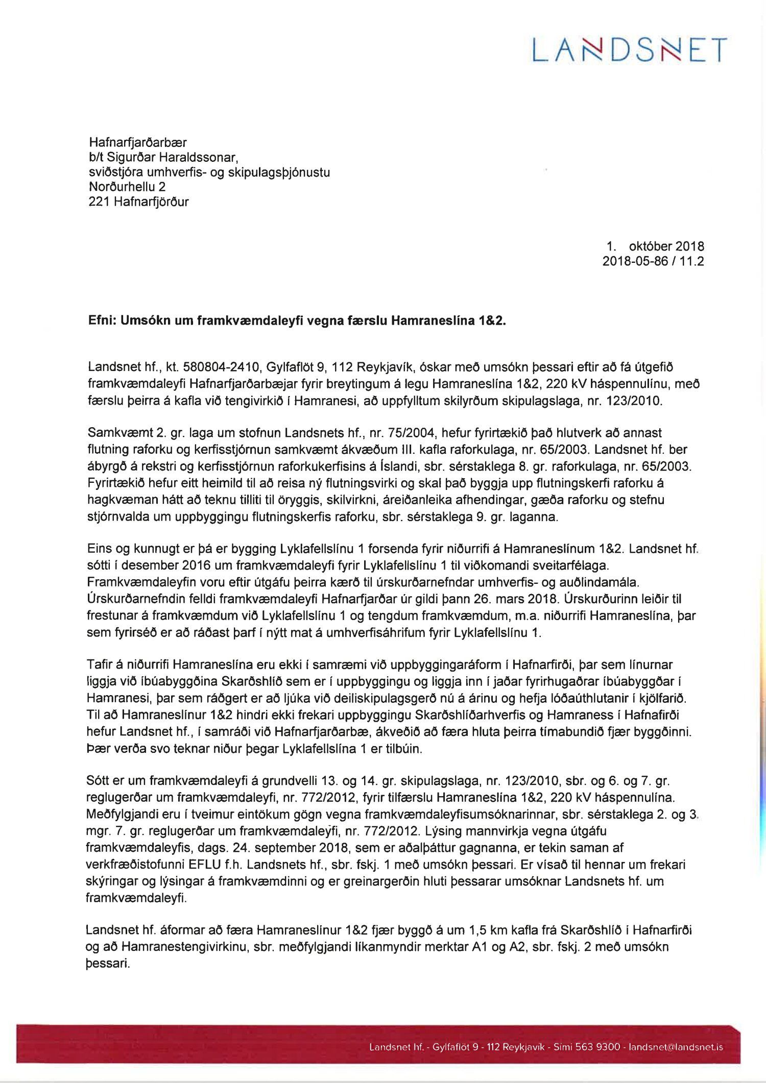 Með vísan í 11.gr. reglugerðar um framkvæmdaleyfi nr. 772/2012 og umsókn Landsnets hf., dags. 1.10.2018, um leyfi til framkvæmda við breytingar á Hamraneslínu samþykkir skipulags- og byggingarráð framkvæmdaleyfið fyrir sitt leyti. Jafnframt leggur skipulag- og byggingarráð til við bæjarstjórn Hafnarfjarðar að hún samþykki framangreint framkvæmdaleyfi með vísan til 11.gr. reglugerðar um framkvæmdaleyfi nr. 772/2012.